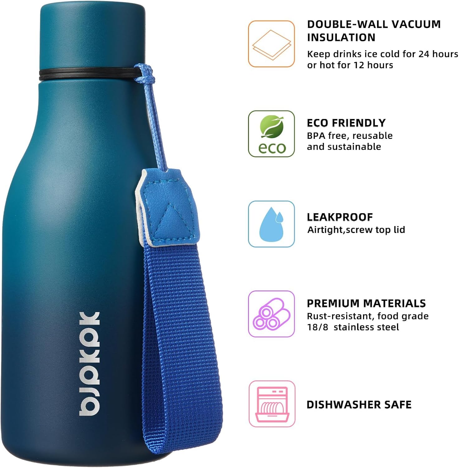 BJPKPK Insulated Water Bottles, 12oz Stainless Steel Metal Water Bottle with Strap, BPA Free Leak Proof Thermos, Mugs, Flasks, Reusable Water Bottle for Sports & Travel, Sea