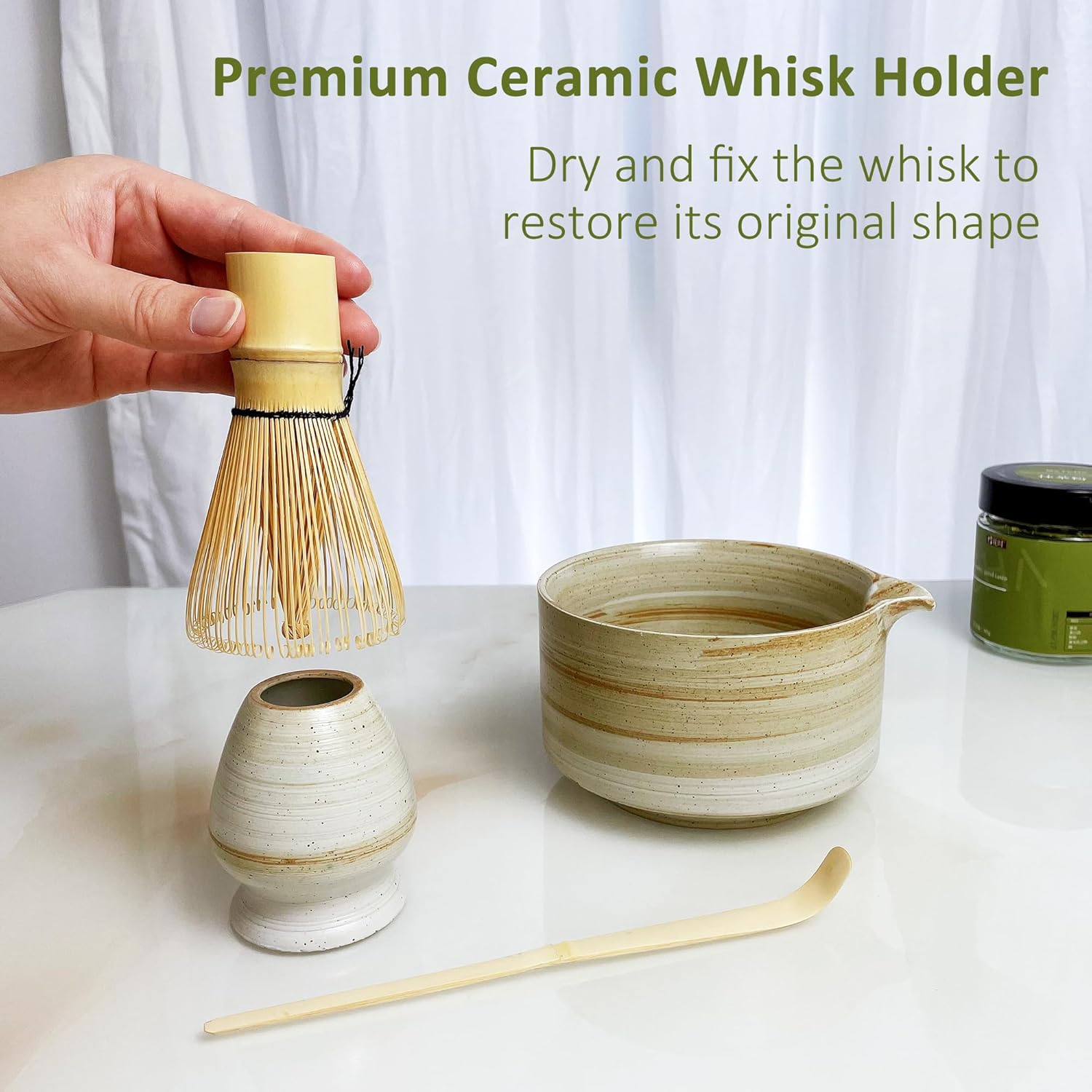 - PERFECT BEGINNER MATCHA SET: YumKubis Perfect 4-piece matcha tea set includes the essentials for traditional handmade tea ceremony: ceramic matcha bowl with pouring spout, bamboo whisk, whisk stand and bamboo spoon. Each tool is carefully crafted, without spending extra money on other non-essential utensils, perfect for matcha lovers and beginners. This matcha starter kit is designed to provide you with simple and easy tea making, allowing you to enjoy a natural and tranquil matcha experience