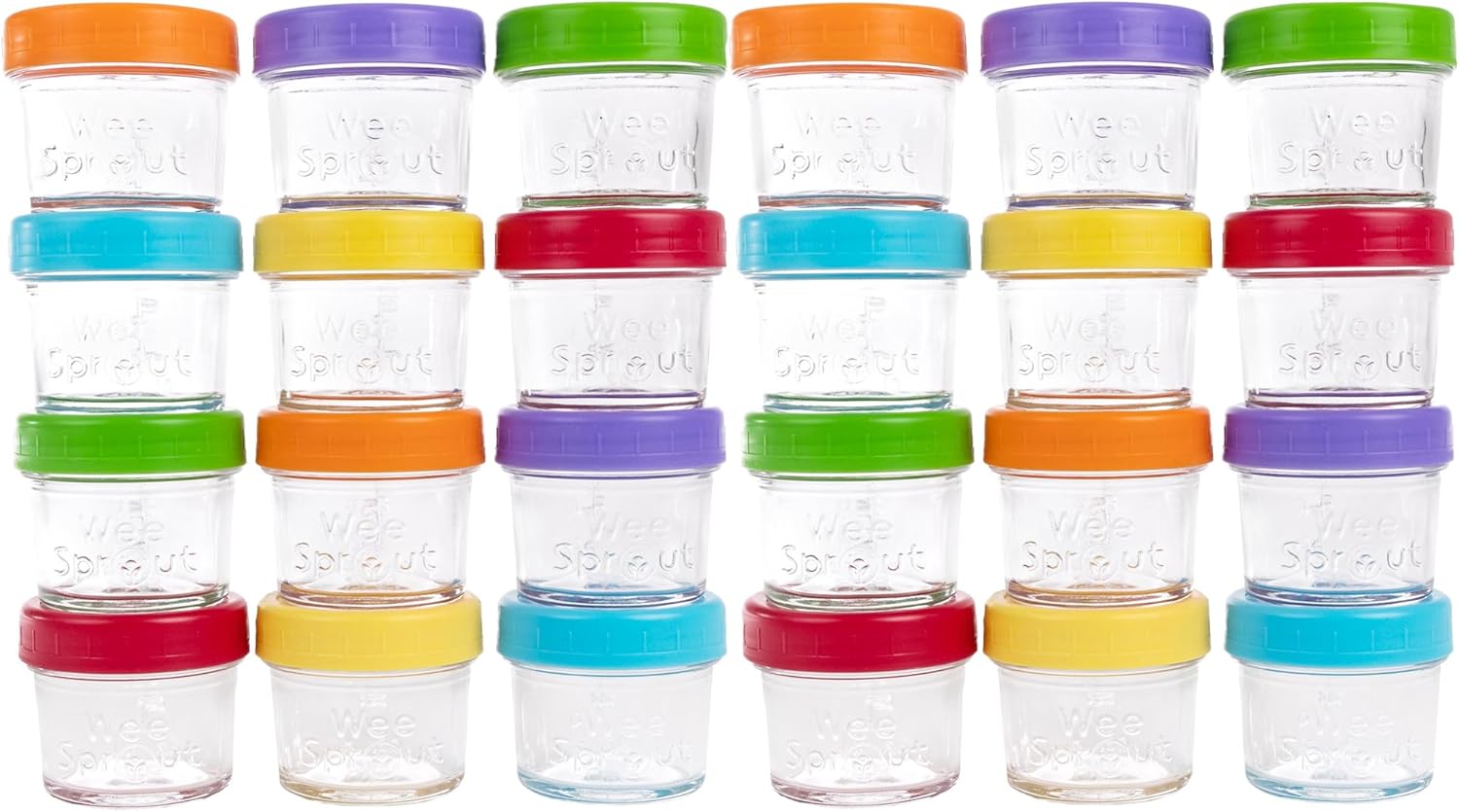 WeeSprout Baby Food Storage Glass Jars w/Lids (4 oz, 24 Pack) Bright Variety, Snack, Reusable Small Containers, Fridge or Freezer, Microwave & Dishwasher Safe, Essentials for Infants