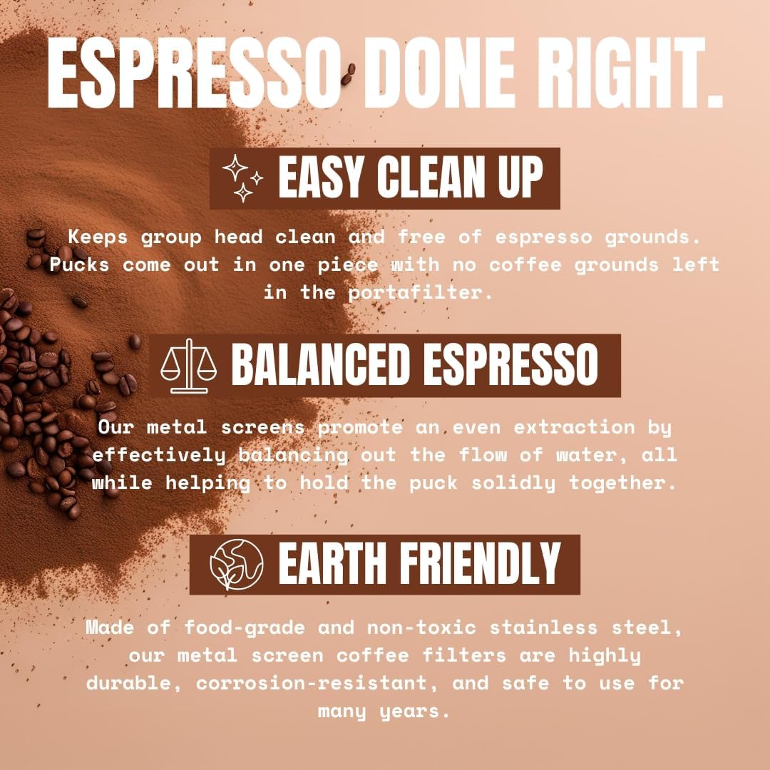 - IMPROVED PERFORMANCE - Constructed of 1.7mm thick stainless steel with a mesh layer of 150μm microns, our metal screens promote an even extraction by effectively balancing out the flow of water, all while helping to hold the puck solidly together. This prevents channeling and spurts from occurring, and ensures the best shot of espresso possible.