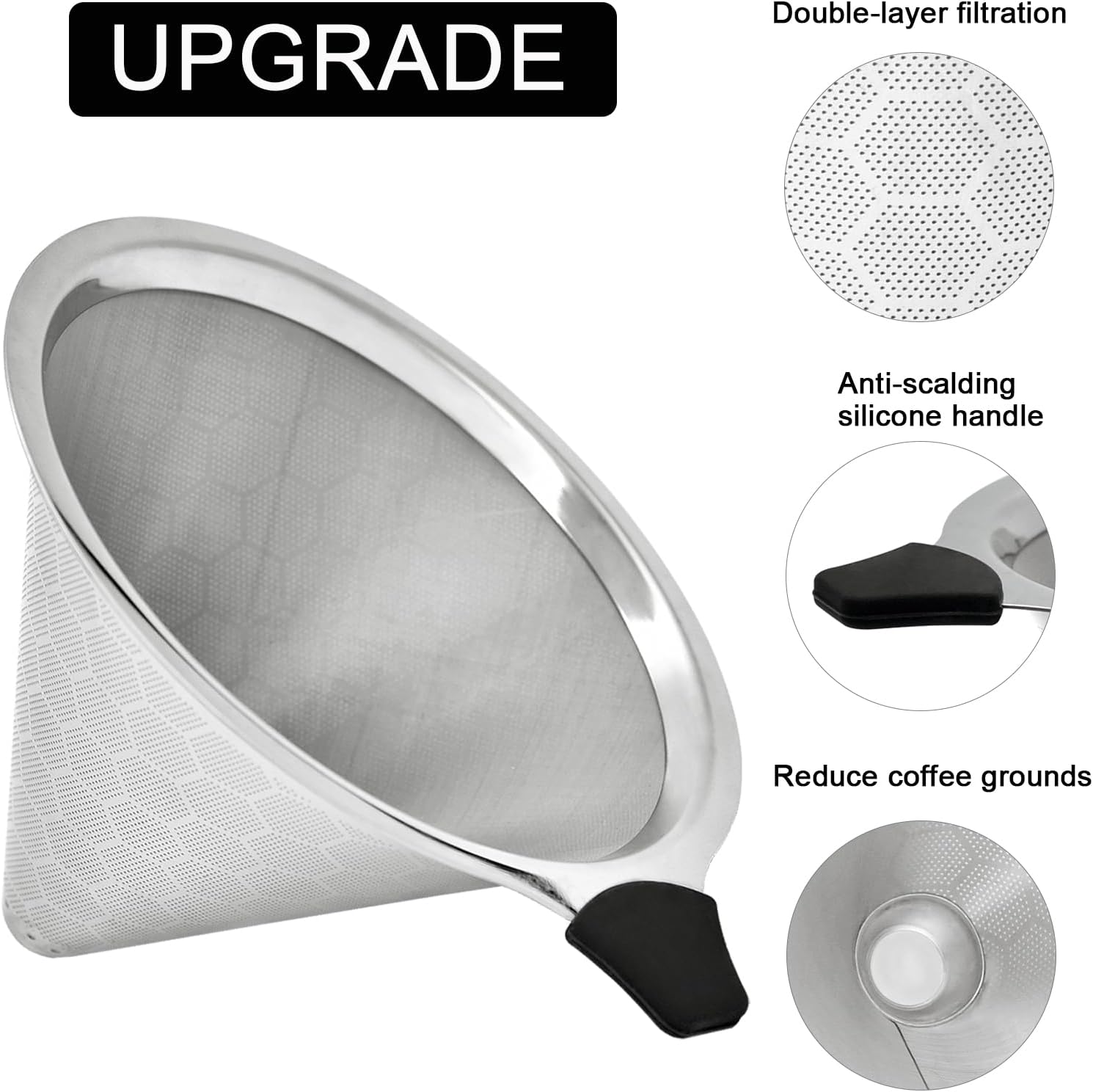 - Improved Handle: Unlike other metal cone coffee filters with easy to damage circular rubber ring designs, our upgraded dripper coffee filter has an upgraded handle with a detachable rubber grip to protect your glass water bottle and help you grip it, making it more comfortable to use.