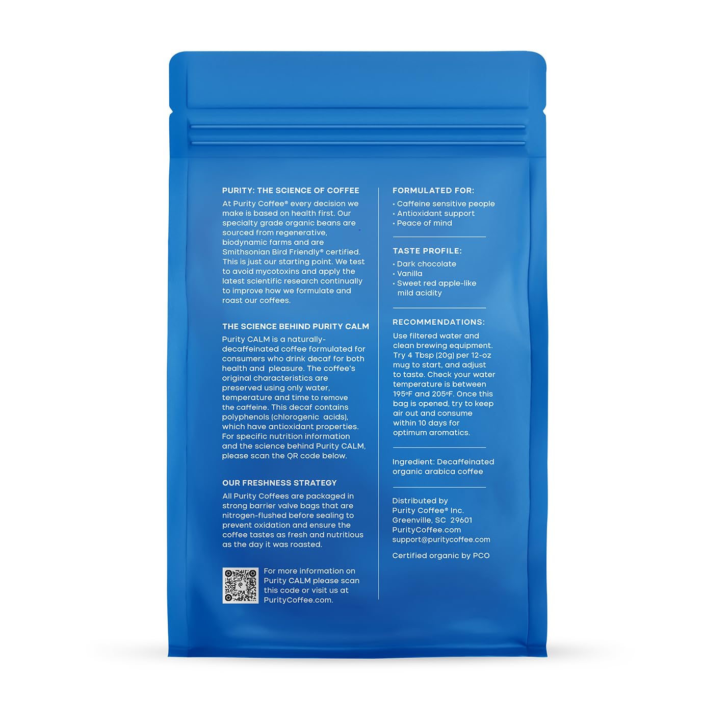 Purity Coffee CALM Decaf Ground Coffee - Natural Water Decaffeinated Coffee - USDA Organic and Third-Party Tested for Antioxidants, Mold, Mycotoxins and Pesticides - 12oz (Purity Calm, medium_roast) | Ground| CALM