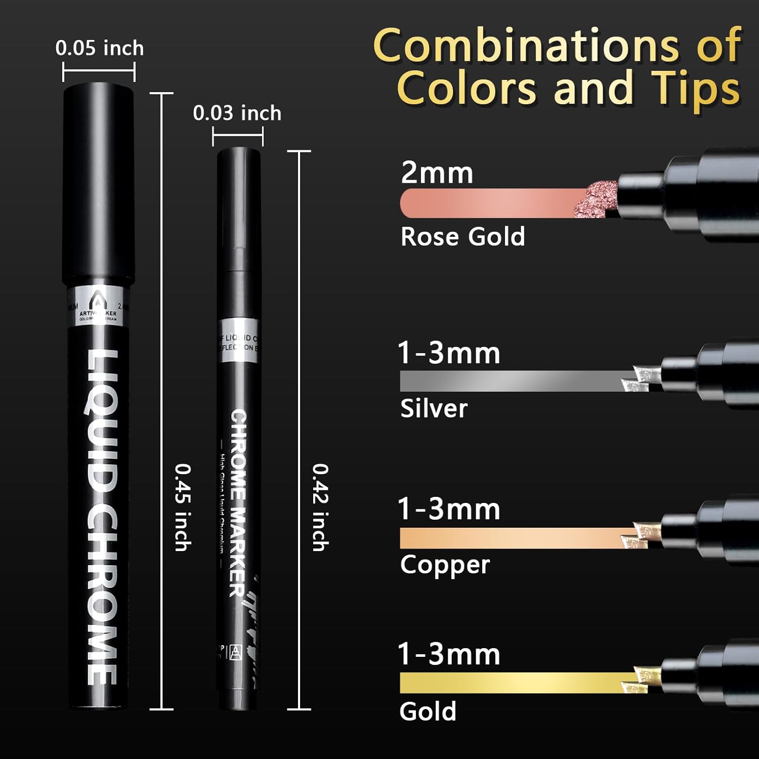 - Multiple Tip Sizes & Colors - Set of metallic pen marker offer 2mm medium tip rose gold metallic paint pen, 1-3mm chisel tip silver marker, gold paint pen and copper metallic marker . Medium tip chrome paint marker is suitable for smooth writing, fine tracing and fine pattern, with strong control. 1-3mm chisel tip chrome pen can freely switch the thickness of the line, suitable for large area coloring, eye-catching writing and chrome effect. Thus liquid chrome marker meet diverse creative needs.