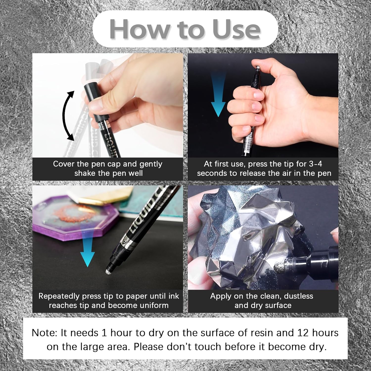 - Easily Use - Firstly gently shake the metallic paint pens, then press the tip of metallic chrome markers for 3-4 seconds, lastly repeatedly press the tip of paint pens for metal to the paper until mirror paint link reach tip. Apply on the clean and dry surface, chrome paint pen bring amazing dual chrome paint for your work.