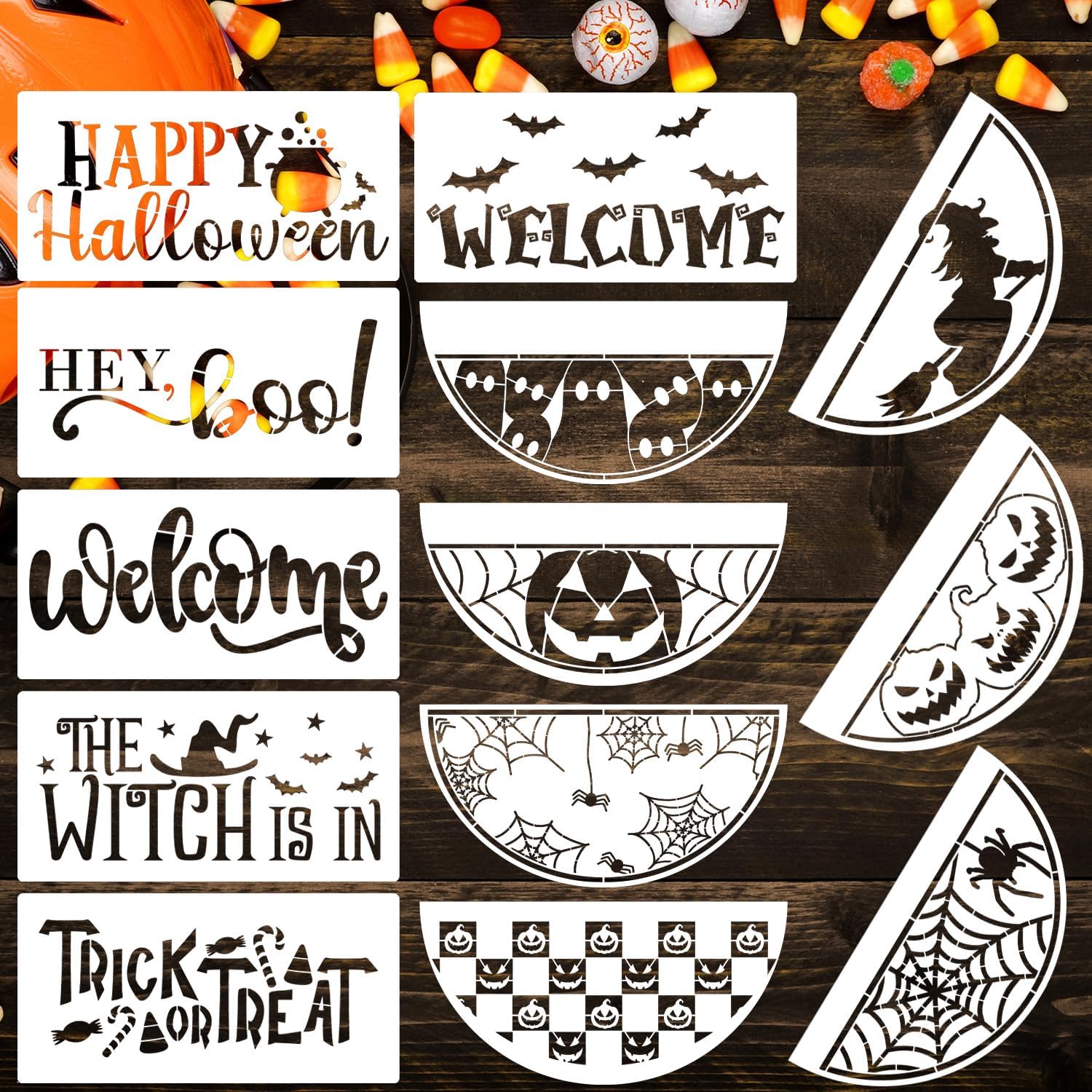 - 12” Halloween Stencils:The Halloween stencil for wood set is a great way to add scary accents to your home decor.Combine the patterned stencil with the Halloween quotes stencil to decorate round wood wreath.Great for indoor use and displayed on a covered front door or porch.
