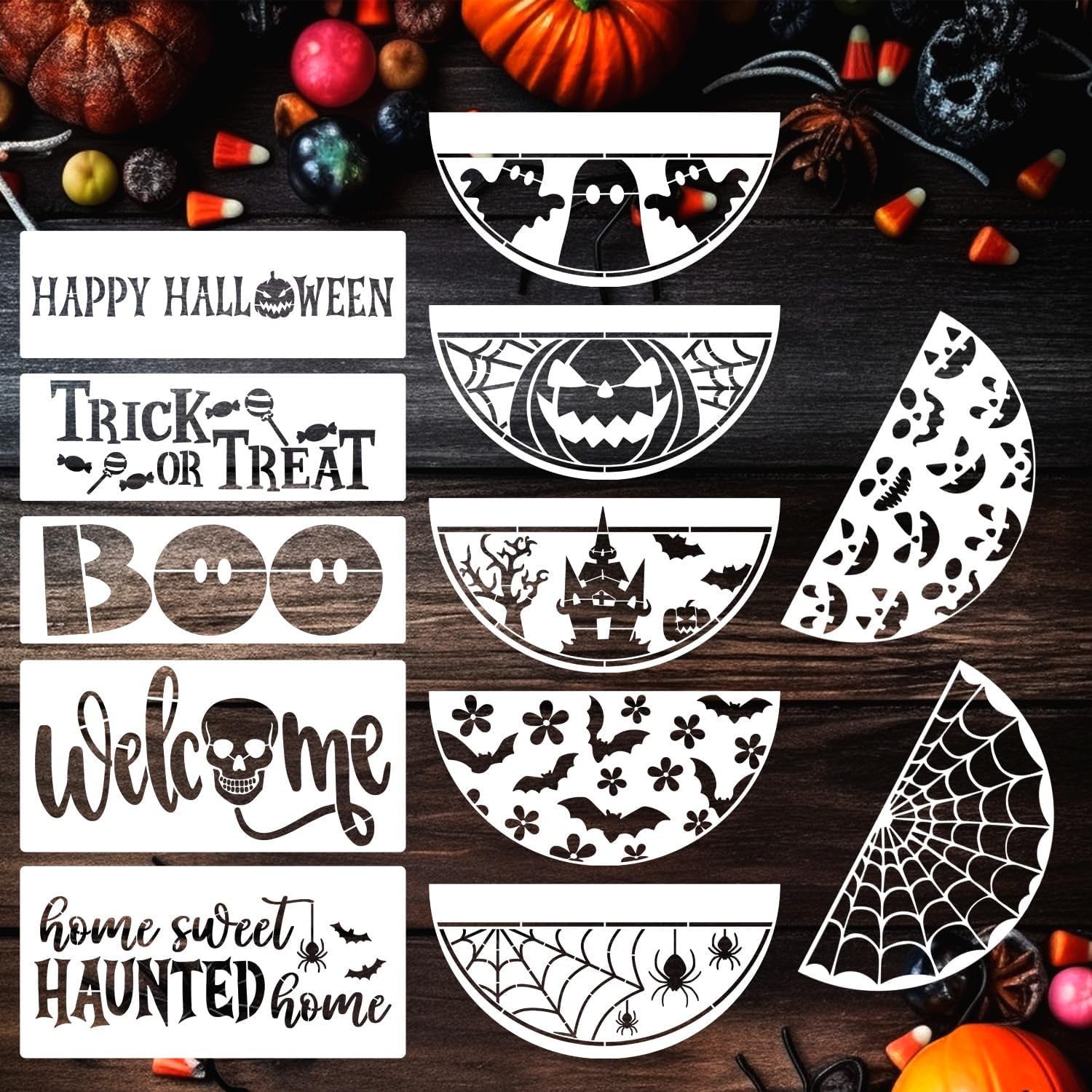 - 12” Halloween Stencils:The Halloween stencil for wood set is a great way to add scary accents to your home decor.Combine the patterned stencil with the Halloween quotes stencil to decorate round wood wreath.Great for indoor use and displayed on a covered front door or porch.