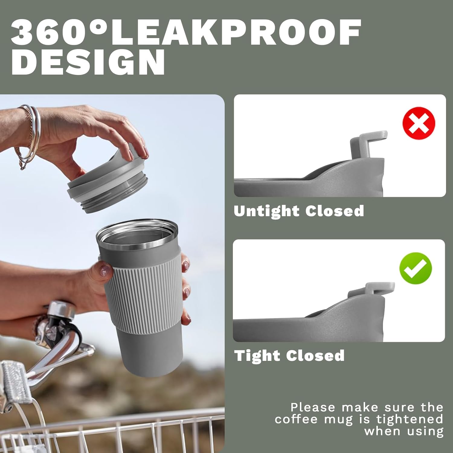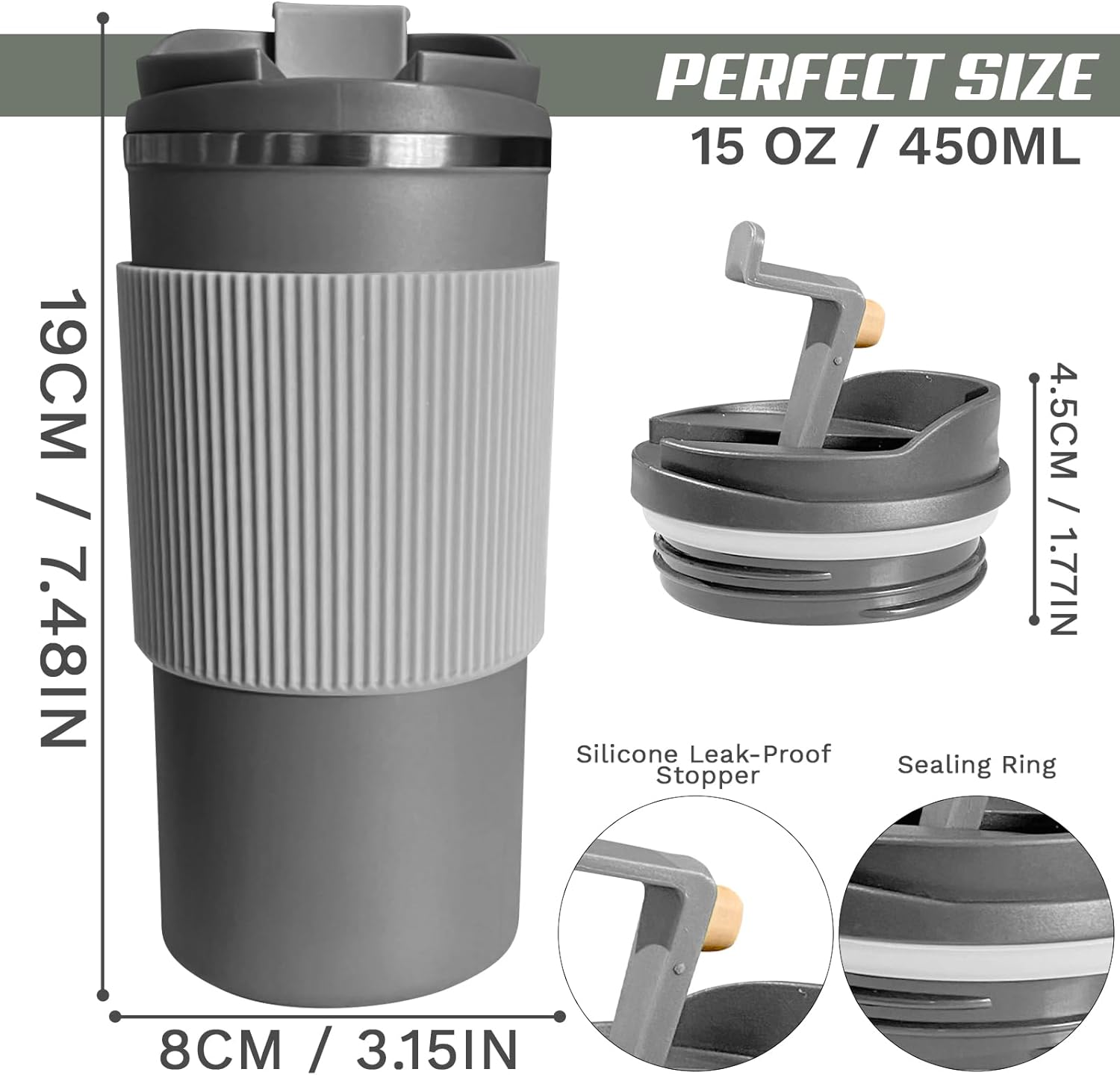 YINBAOGE Insulated Travel Coffee Mug Spill Proof Leak Proof Pobtable To Go Camping Stainless Steel Coffee Tumbler Reusable Coffee Cups with Lids Thermos for Hot and Cold Drink (4th-Gray, 15OZ)