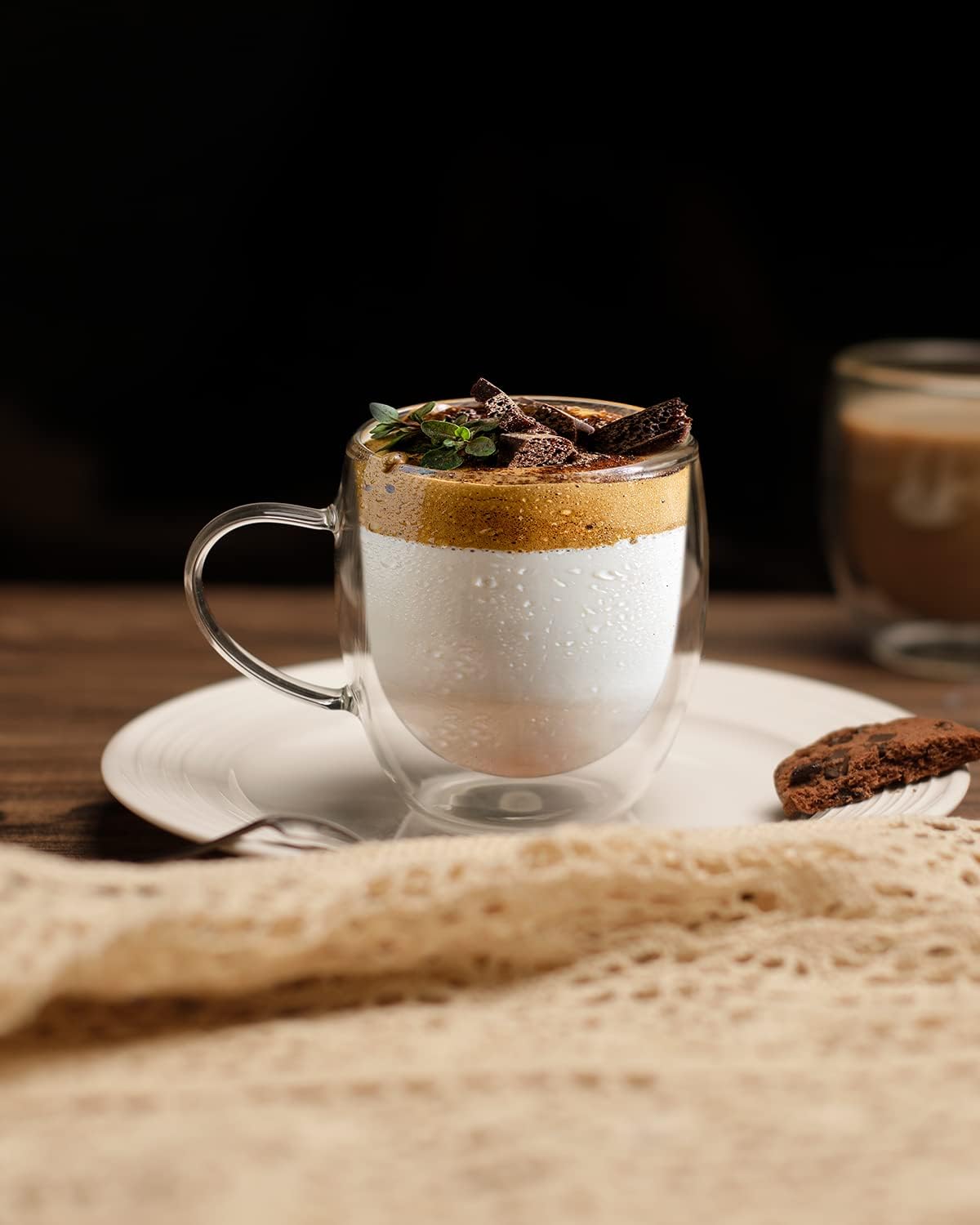 - FOOD-GRADE BOROSILICATE GLASS - The cappuccino latte cup 250 ml is made of heat and condensation-resistant borosilicate glass, accept temperature from -30℃ to 150℃, and are very robust than other normal glass mugs. TIPS: hand wash is recommended.