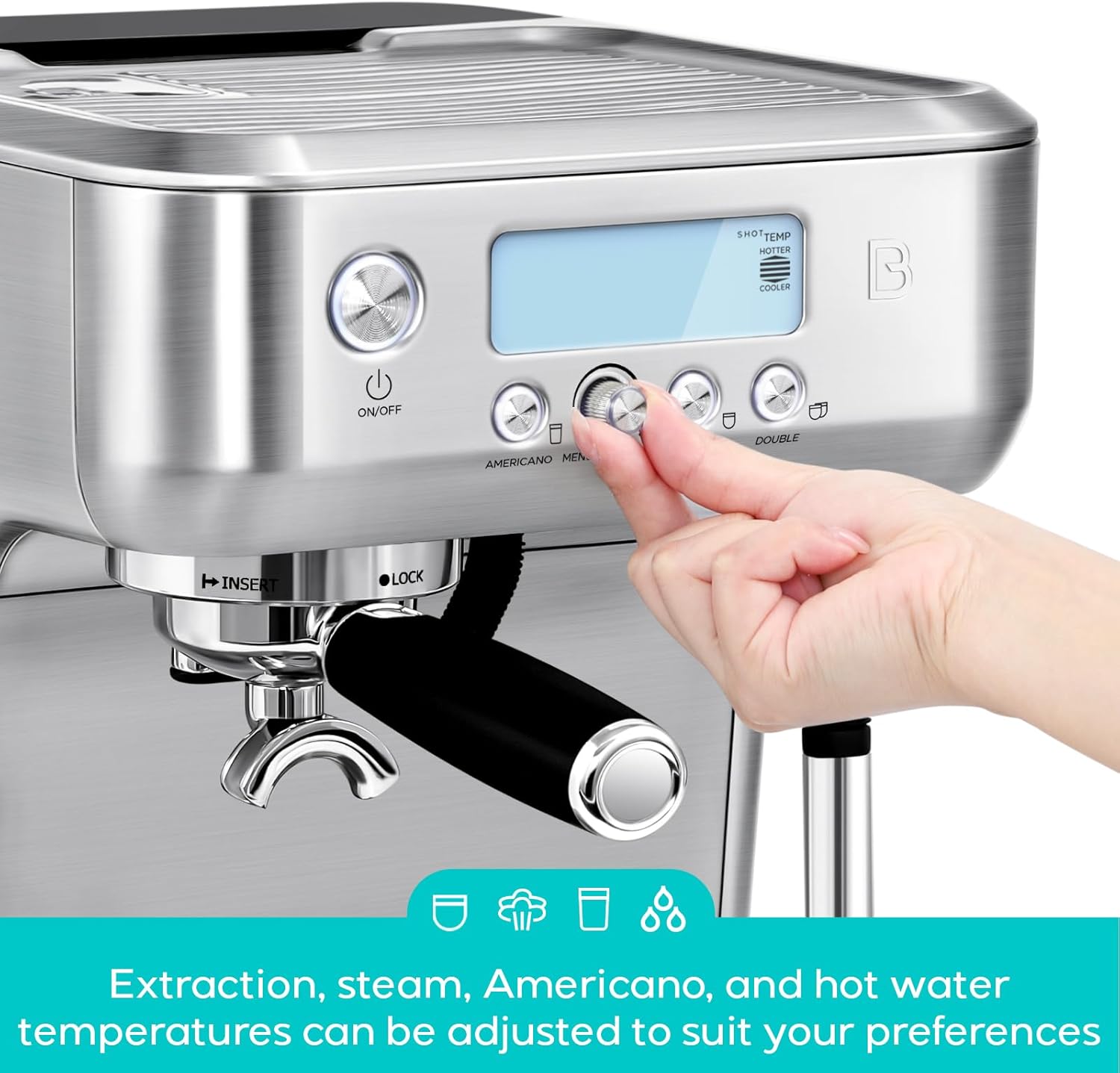 - Brew Your Favorite Espresso at Home: Featuring an intuitive LCD, this espresso machine guides you through the coffee-making process with animated instructions for extraction, brewing, and steaming. It provides precise information to help you create barista-quality lattes, cappuccinos, macchiatos, and Americanos in the comfort of your home. Additionally, the display delivers prompts and notifications, ensuring smooth operation and making it easy to craft the perfect espresso-based drinks
