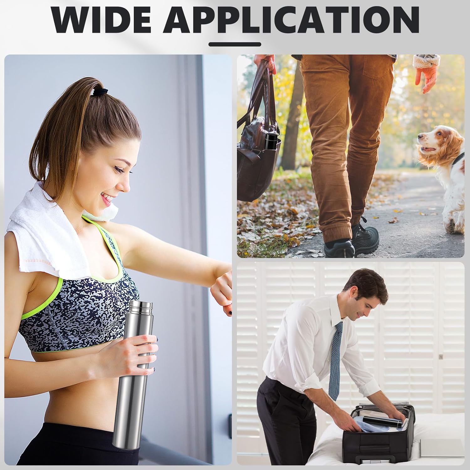 - Wide Applications: the slim water flask is wide application, you can use the purse water bottle for taking meds, having a doctor's appointment, having an emergency drink, eating outside, taking a short hike, walk, trips, going to the movie theater, bicycling, running, yoga, golf, camping, short errands, going to the gym, meetings, business trips, and more