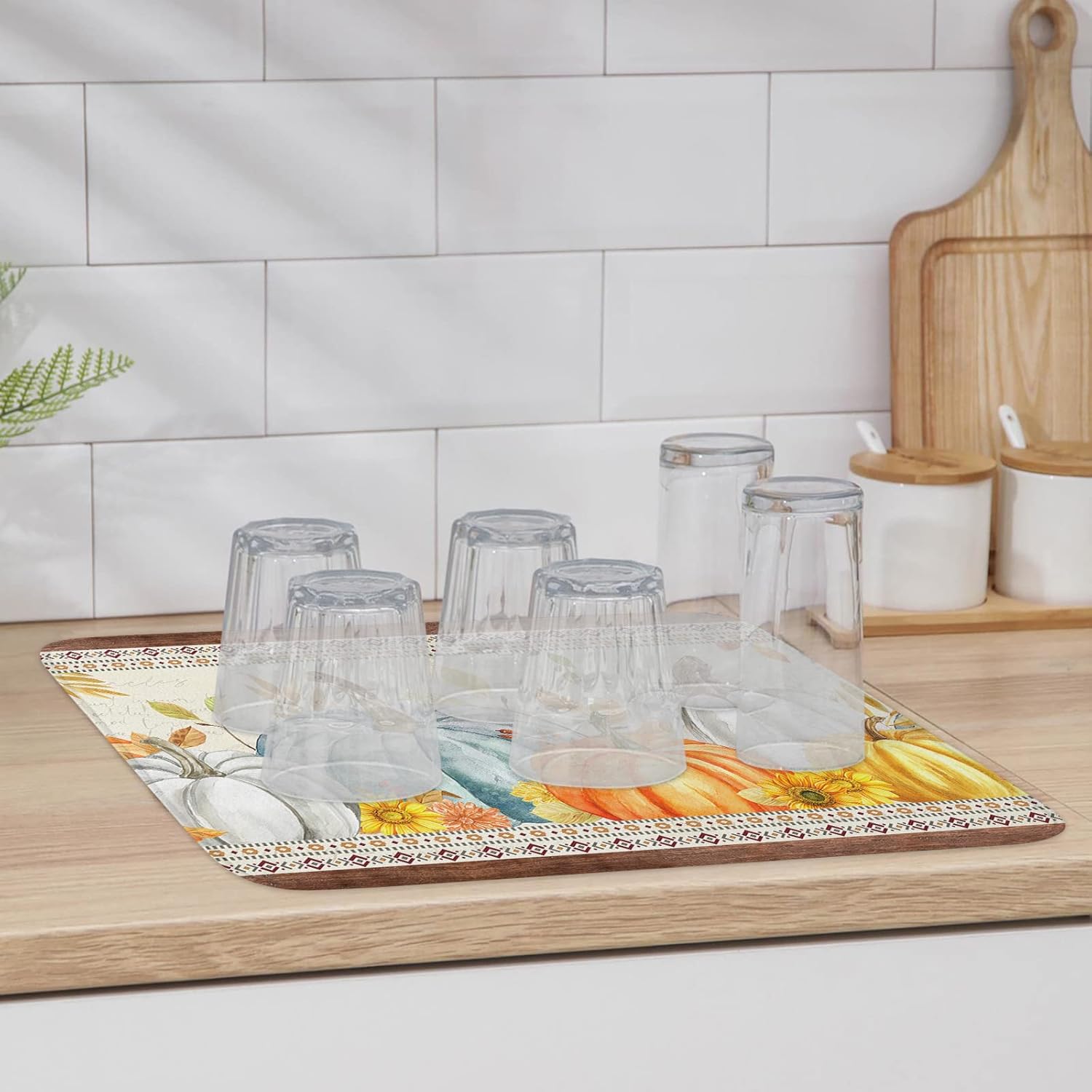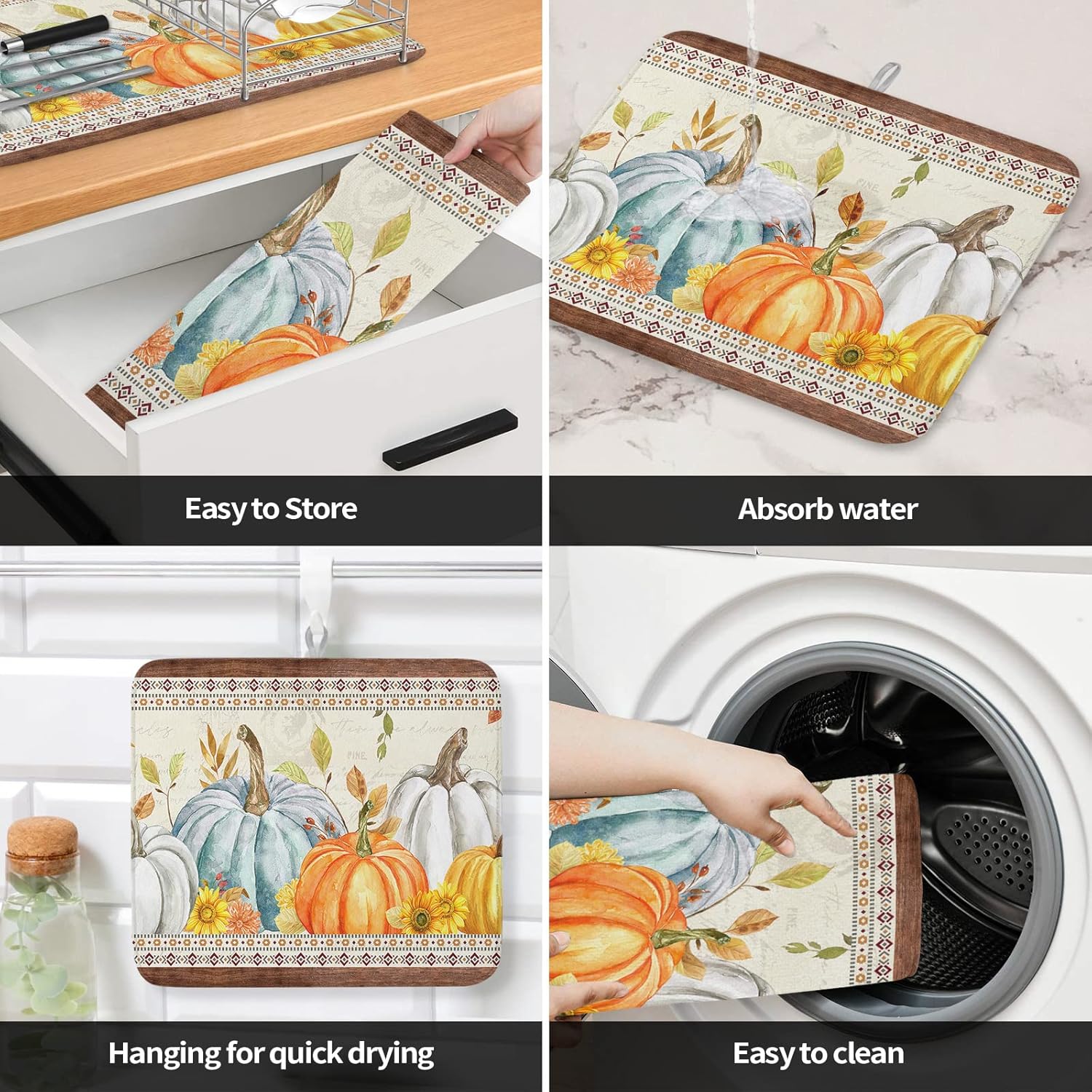 Fall Dish Drying Mat for Kitchen Counter Pumpkin Drying Pad Absorbent Drying Mats for Countertops Sinks Draining Racks Sunflower Eucalyptus Leaves Drainer Holiday Harvest Thanksgiving Decor 16x18