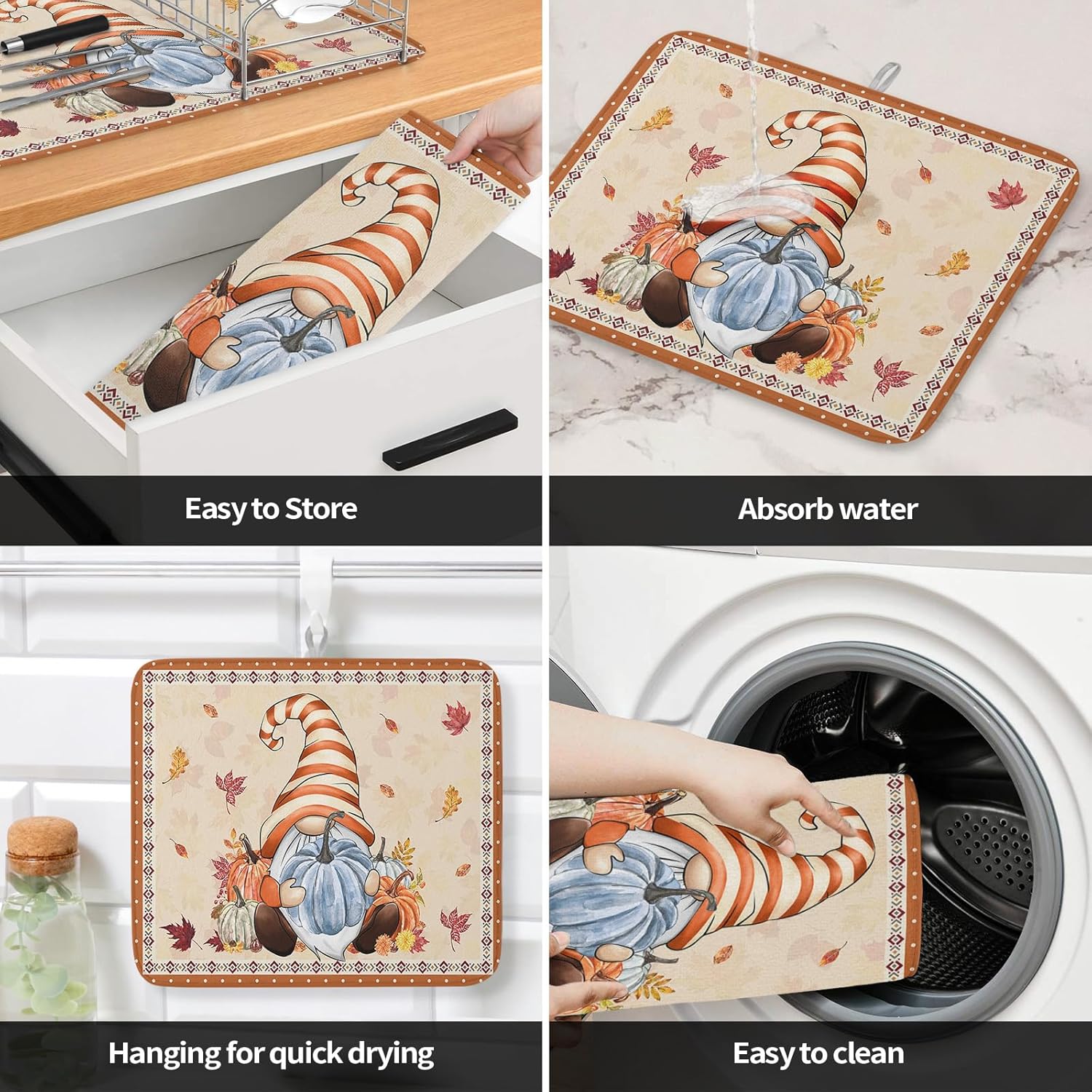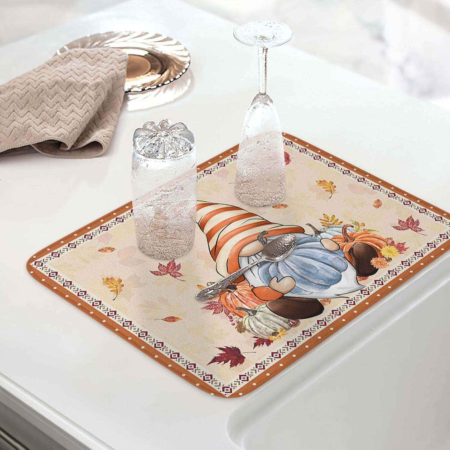 Fall Dish Drying Mat for Kitchen Counter Pumpkin Gnome Drying Pad Absorbent Drying Mats for Countertops Sinks Draining Racks Autumn Maple Leaves Drainer Holiday Harvest Thanksgiving Decorations 16x18