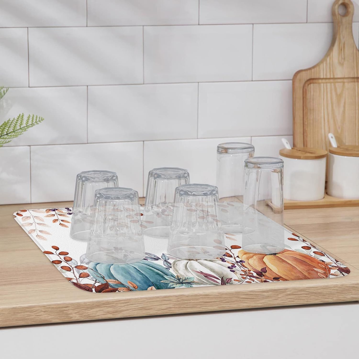Fall Dish Drying Mat for Kitchen Counter Pumpkin Drying Pad Absorbent Drying Mats for Countertops Sinks Draining Racks Autumn Eucalyptus Leaves Drainer Holiday Harvest Thanksgiving Decorations 16x18