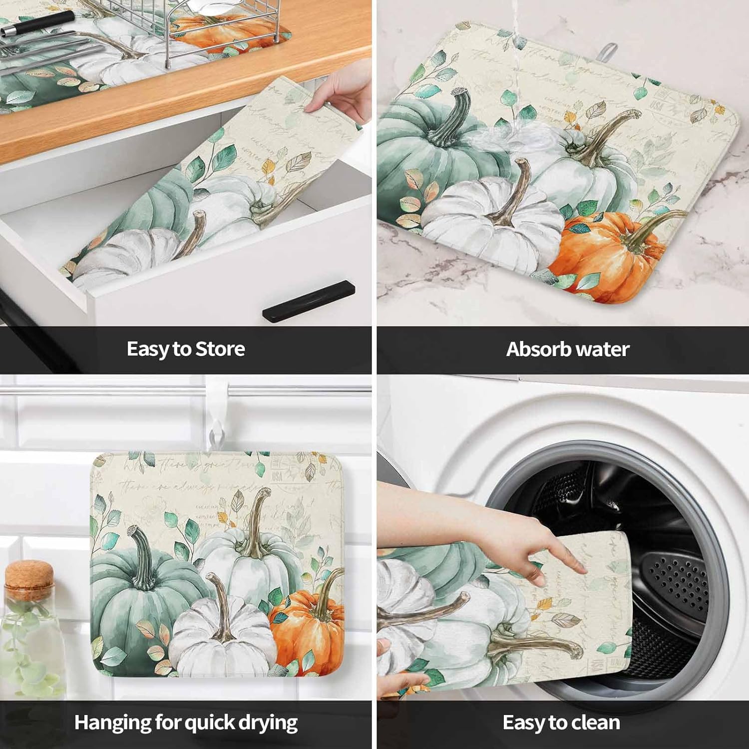 Fall Dish Drying Mat for Kitchen Counter Green Pumpkin Drying Pad Absorbent Drying Mats for Countertops Sinks Draining Racks Eucalyptus Leaves Drainer Holiday Harvest Thanksgiving Decorations 18x24