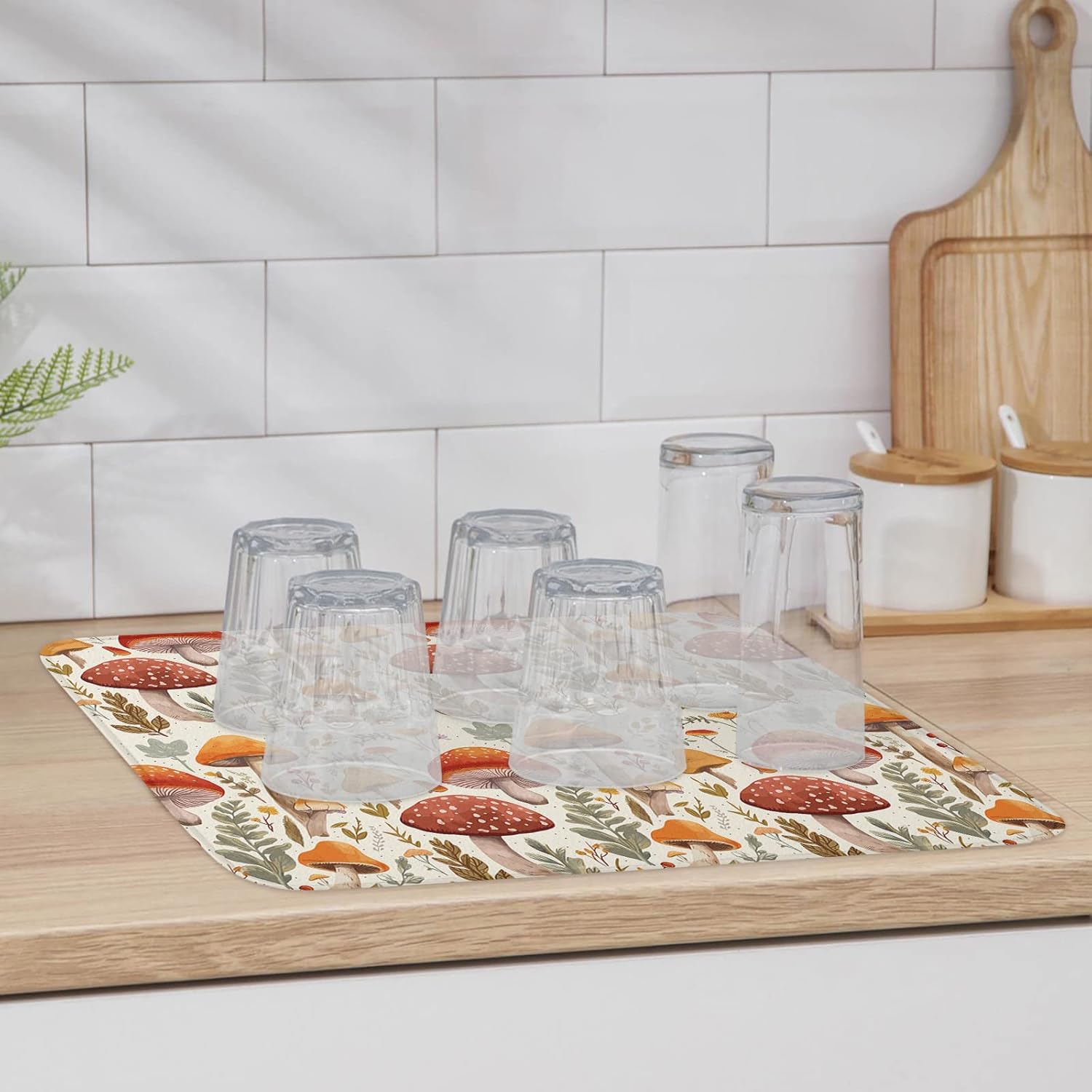 Fall Dish Drying Mat for Kitchen Counter Mushroom Drying Pad Absorbent Drying Mats for Countertops Sinks Draining Racks Autumn Plant Leaves Drainer Holiday Harvest Thanksgiving Decorations 18x24