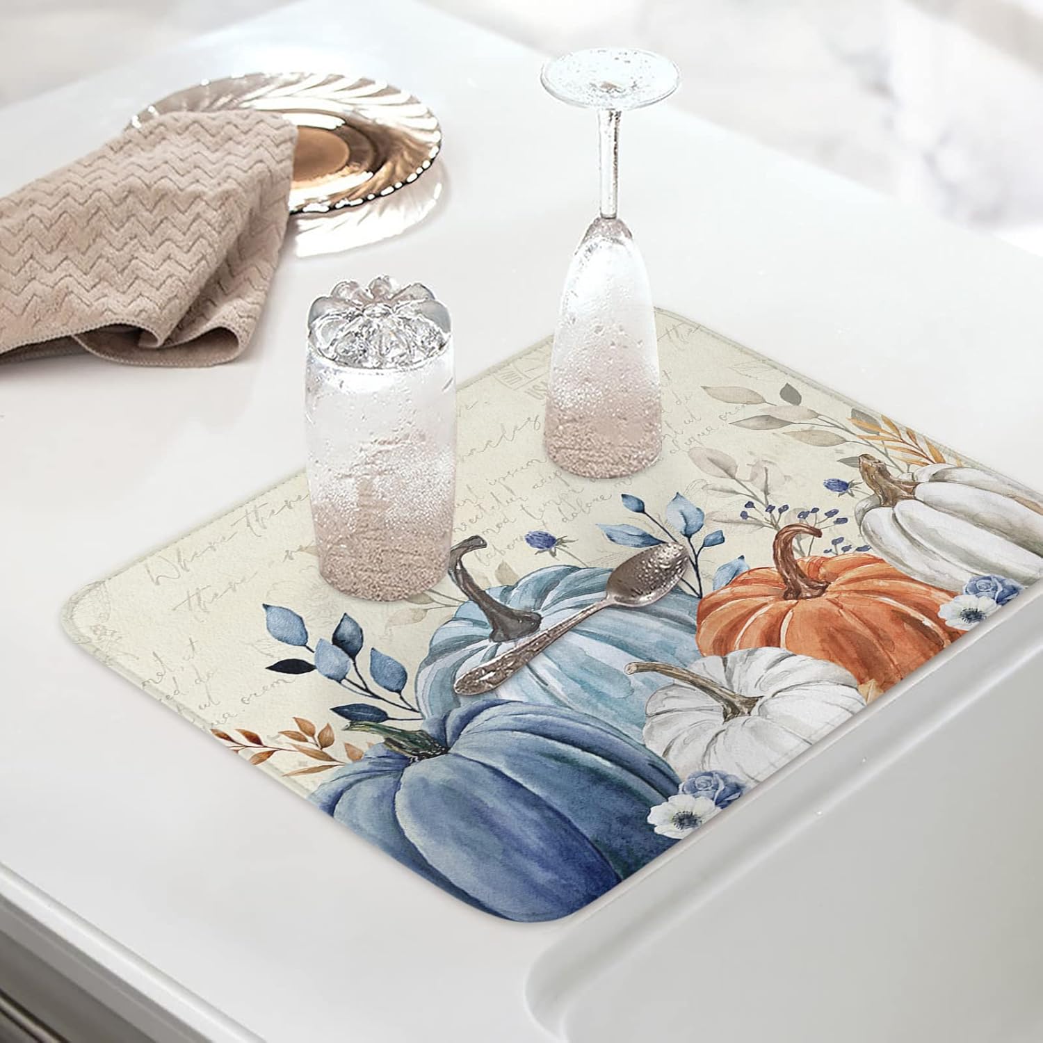 Fall Dish Drying Mat for Kitchen Counter Blue Pumpkin Drying Pad Absorbent Drying Mats for Countertops Sinks Draining Racks Floral Leaves Drainer Holiday Harvest Thanksgiving Decorations 16x18