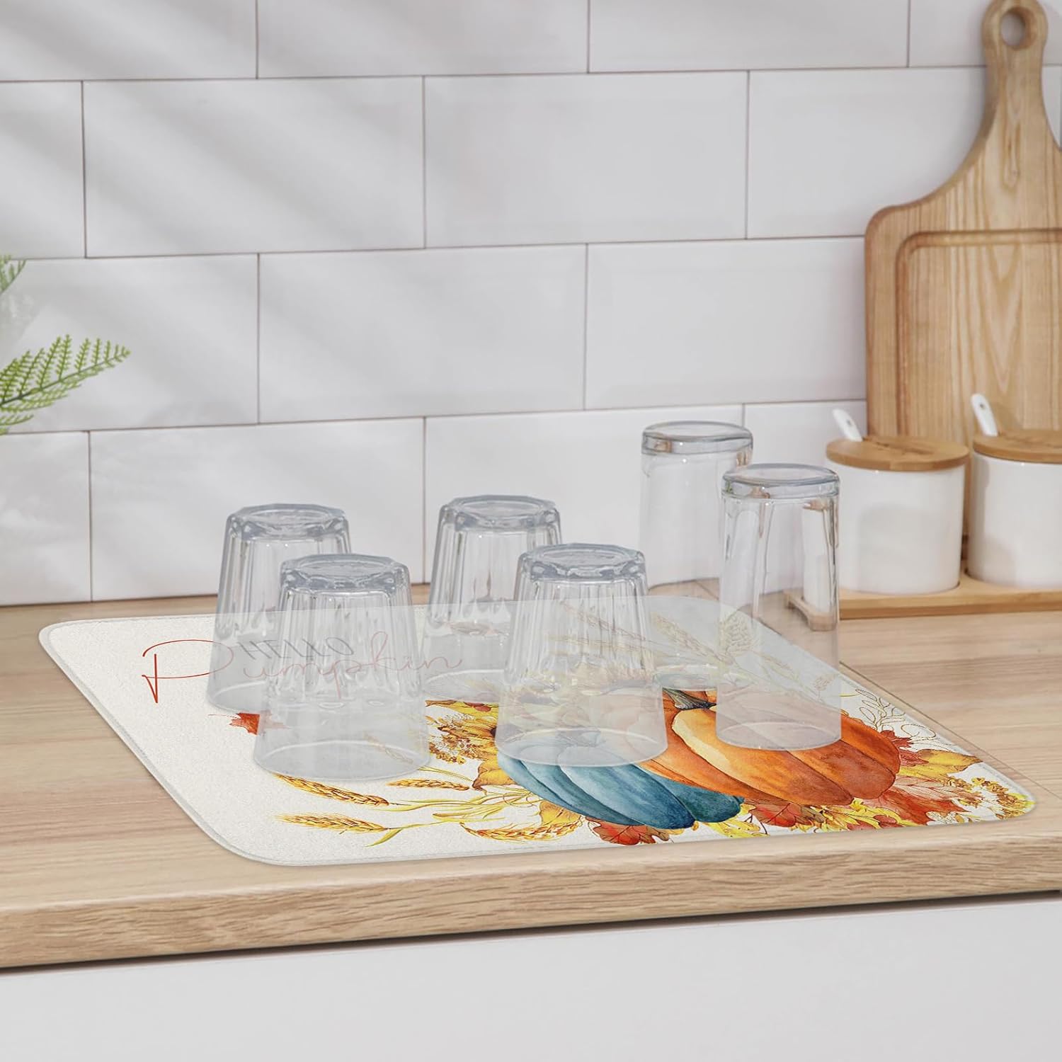 Fall Dish Drying Mat for Kitchen Counter Hello Pumpkin Drying Pad Absorbent Drying Mats for Countertops Sinks Draining Racks Sunflower Ears of Wheat Drainer Holiday Harvest Thanksgiving Decor 18x24