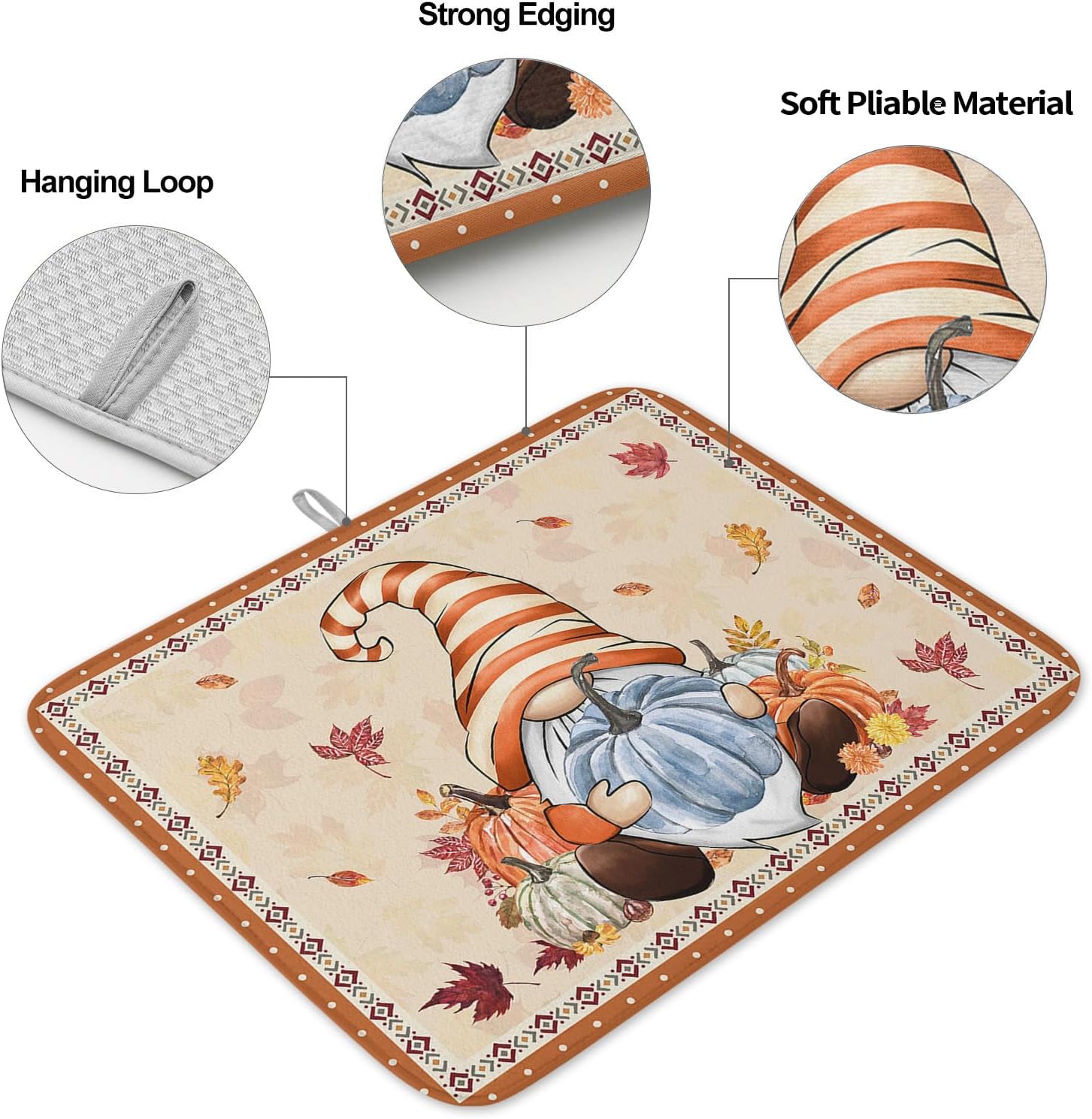- Fall & Thanksgiving Decor - Pumpkin with gnome drying mats can add an chic holiday vibe and charm to your kitchen or coffee bar counter. The drying mat for kitchen counter with a unique hanging rope design that can be hung without occupying any space.