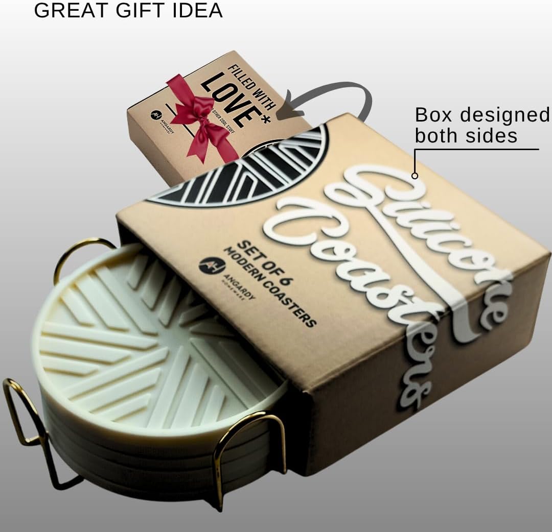 - Elegant Design and Organized Storage: Includes 6 ivory silicone coasters with a modern geometric pattern and a gold metal holder, perfect for stylish home decor.