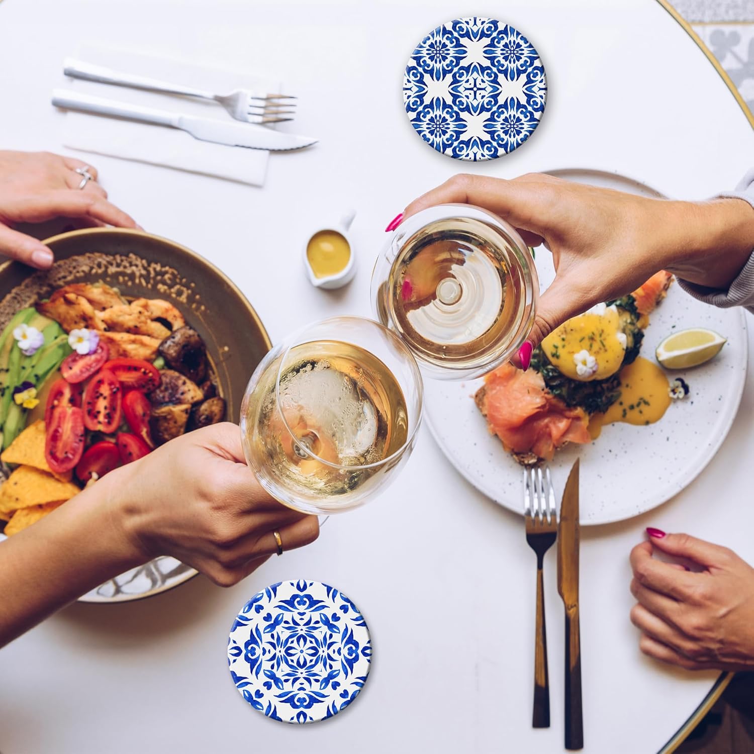 - Husiti Ceramic Coasters Set With Metal Holder: Keep Your Dining Table Stylish And Organized With This Set Of 6 4-Inch Round Coasters Featuring a Trendy Handpainted Blue Pattern Pattern.
