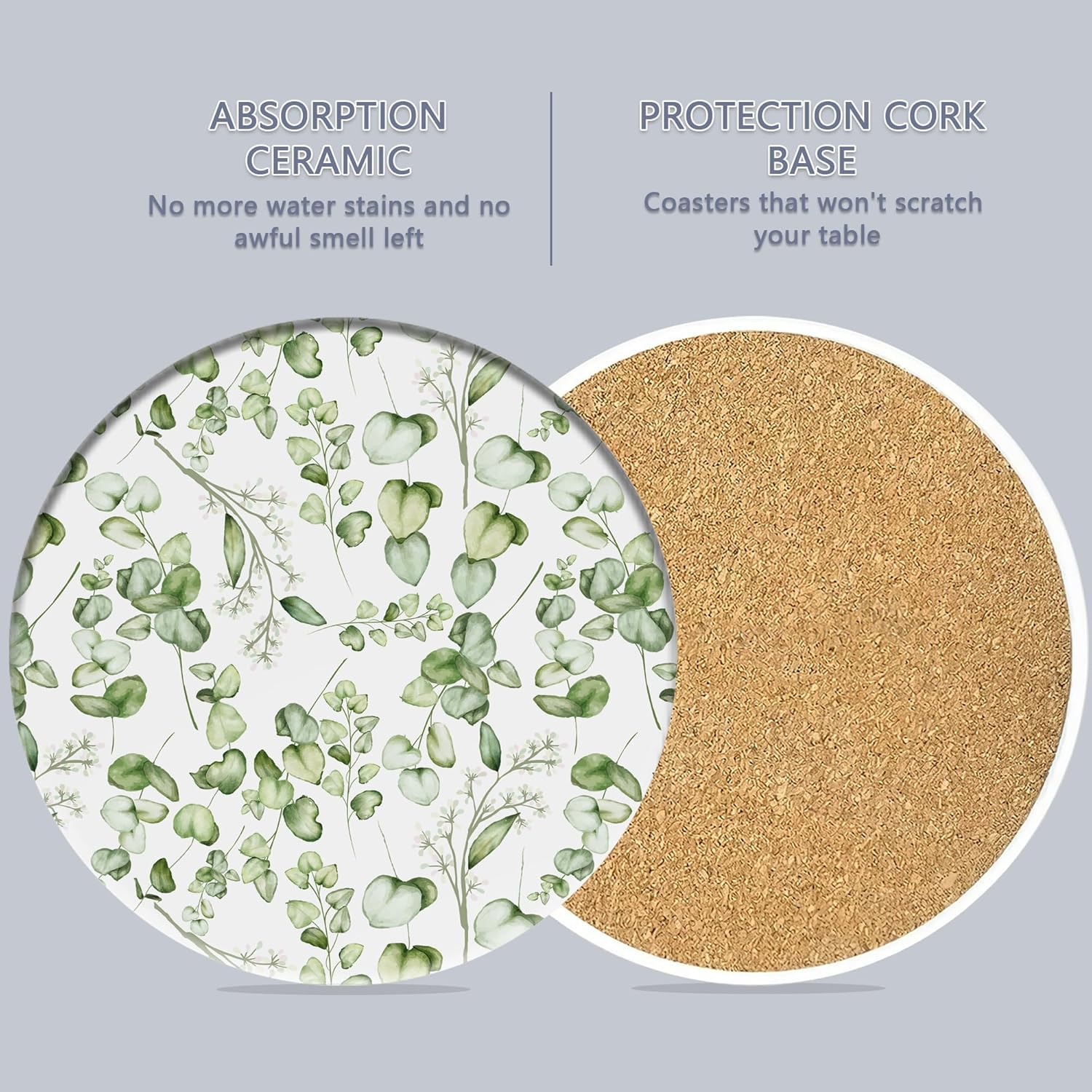 Table Coaster for Drinks Set of 6, Eucalyptus Leaf Flower Watercolor Round Ceramic Coasters,with Cork Base and Metal Holder,Great Housewarming Birthday Gifts,Home Decor