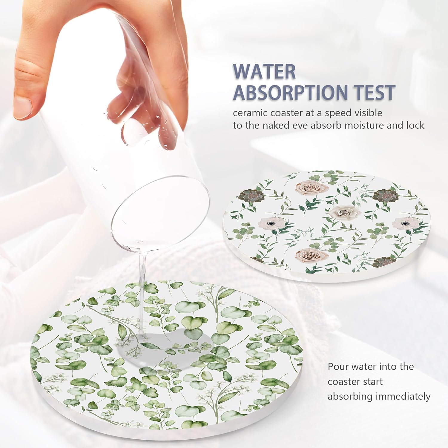 - Husiti Ceramic Coasters Set With Metal Holder: Keep Your Dining Table Stylish And Organized With This Set Of 6 4-Inch Round Coasters Featuring a Trendy Eucalyptus Leaf Flower Watercolor Pattern.