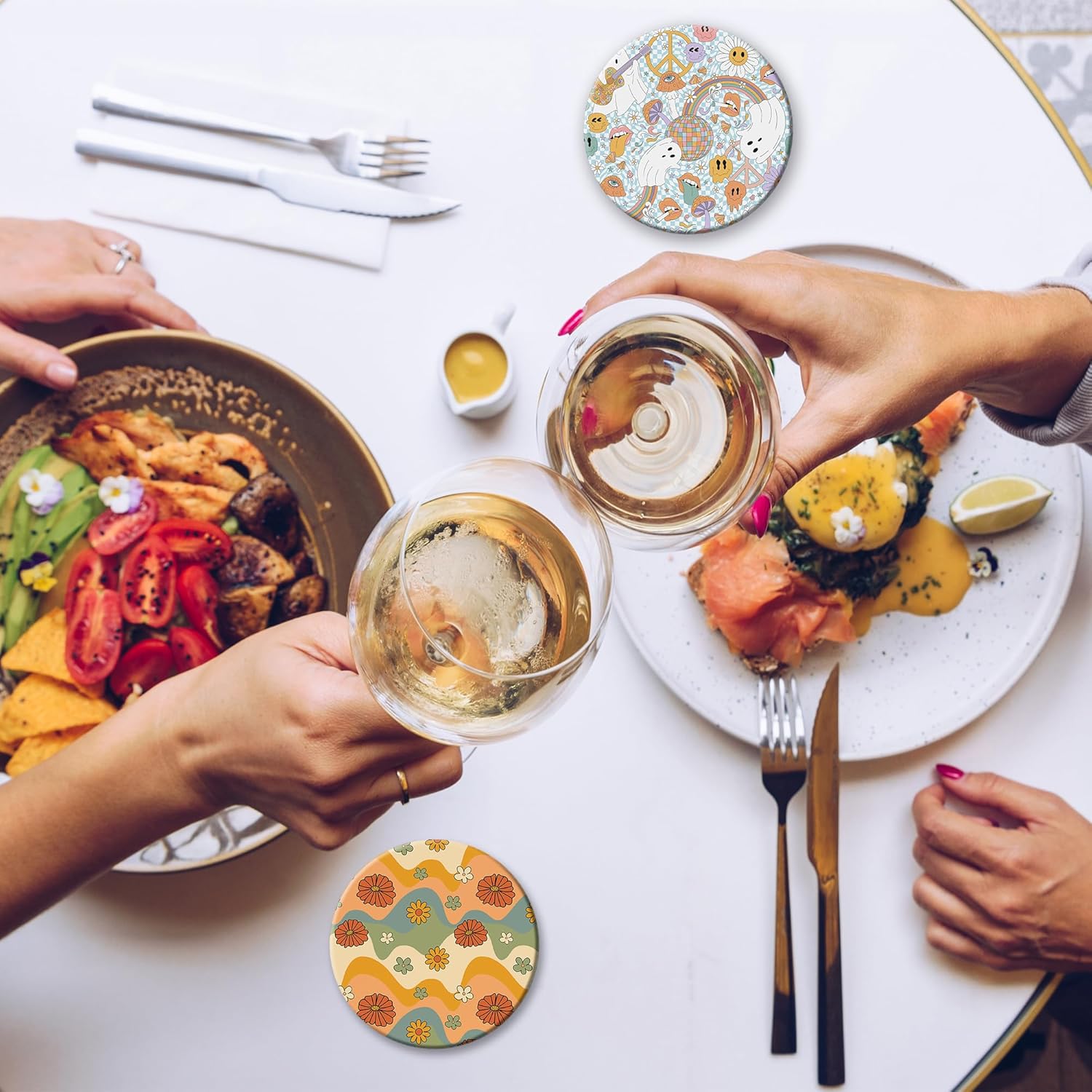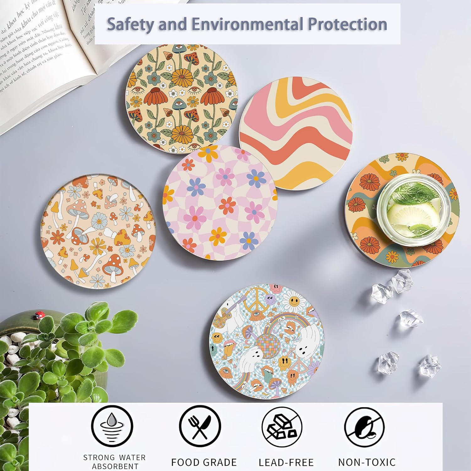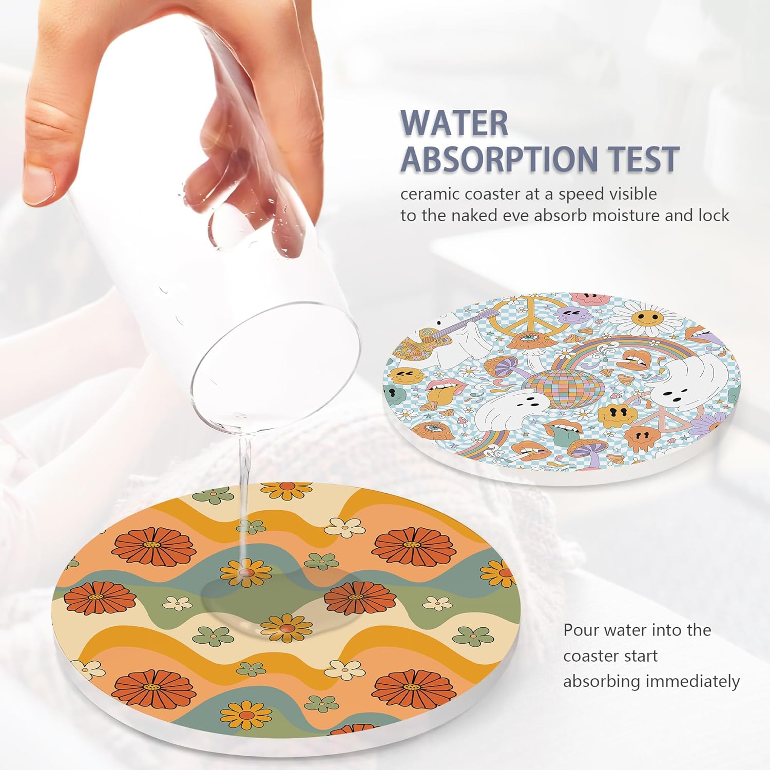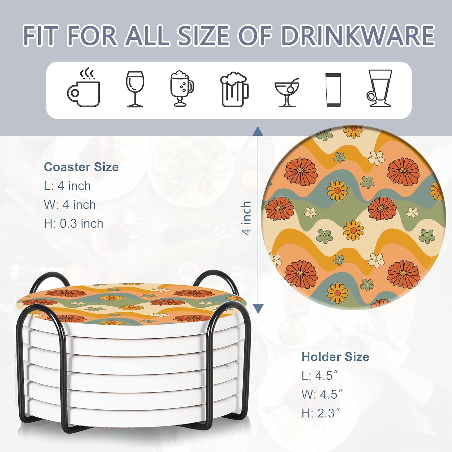 - Husiti Ceramic Coasters Set With Metal Holder: Keep Your Dining Table Stylish And Organized With This Set Of 6 4-Inch Round Coasters Featuring a Trendy Retro 70s Colorful Groovy Pattern.