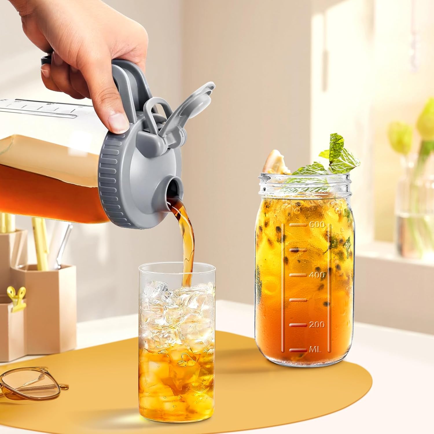 - Classic Design: Mason jar pitcher with a lid features a classic design that combines aesthetic charm with practical functionality. The transparent glass body beautifully showcases the contents, whether it's a colorful lemonade, iced tea, or fruit-infused water. The included lid adds to its timeless appeal while also serving a practical purpose by keeping your beverages fresh and protected from dust and debris.