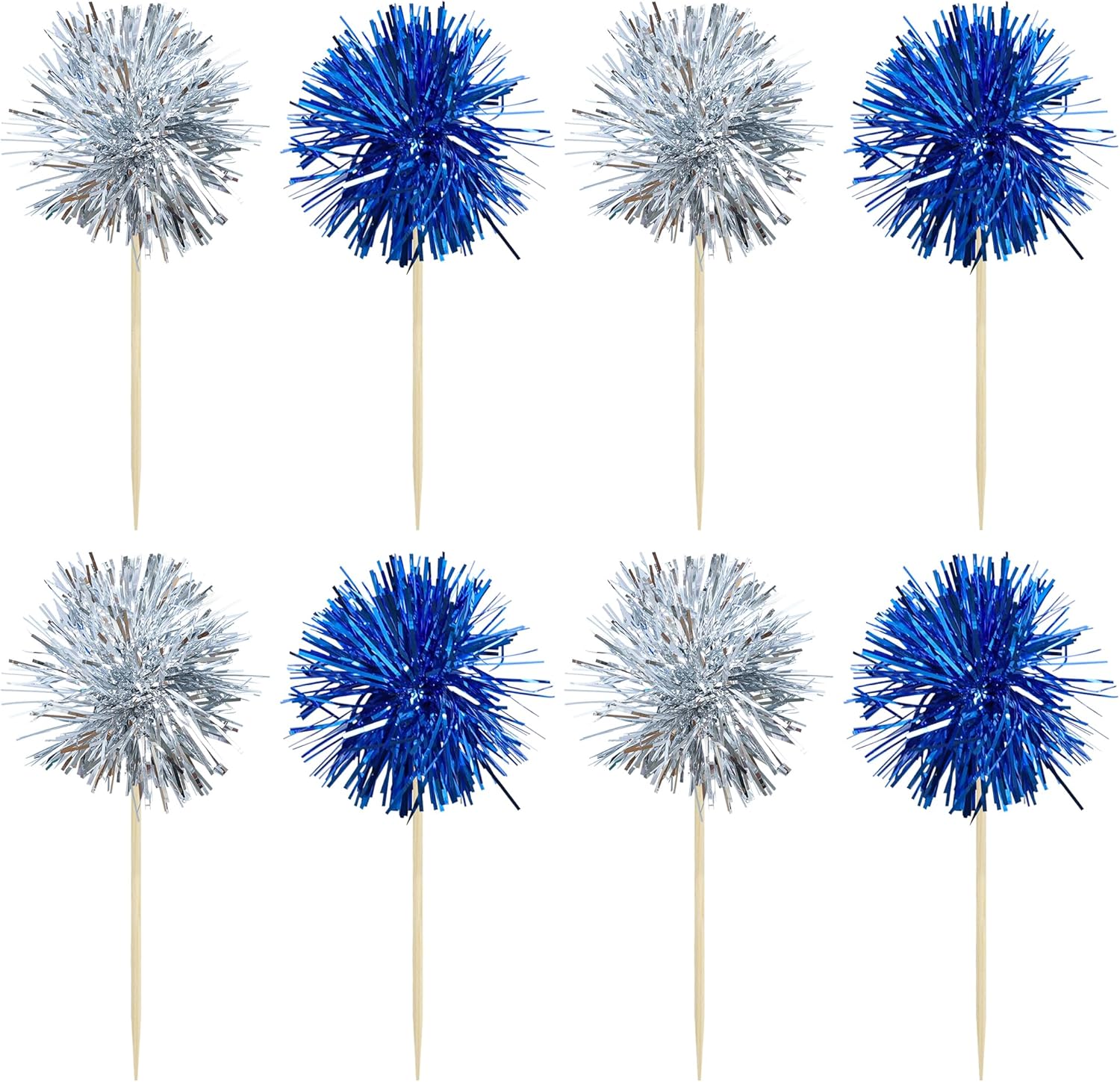 Gyufise 30Pcs Foil Firework Cupcake Toppers Sparkle Tinsel Cake Toppers Tinsel Drink Cake Decoration Cocktail Picks for Birthday Wedding Graduation Party Supplies Silver Dark Blue