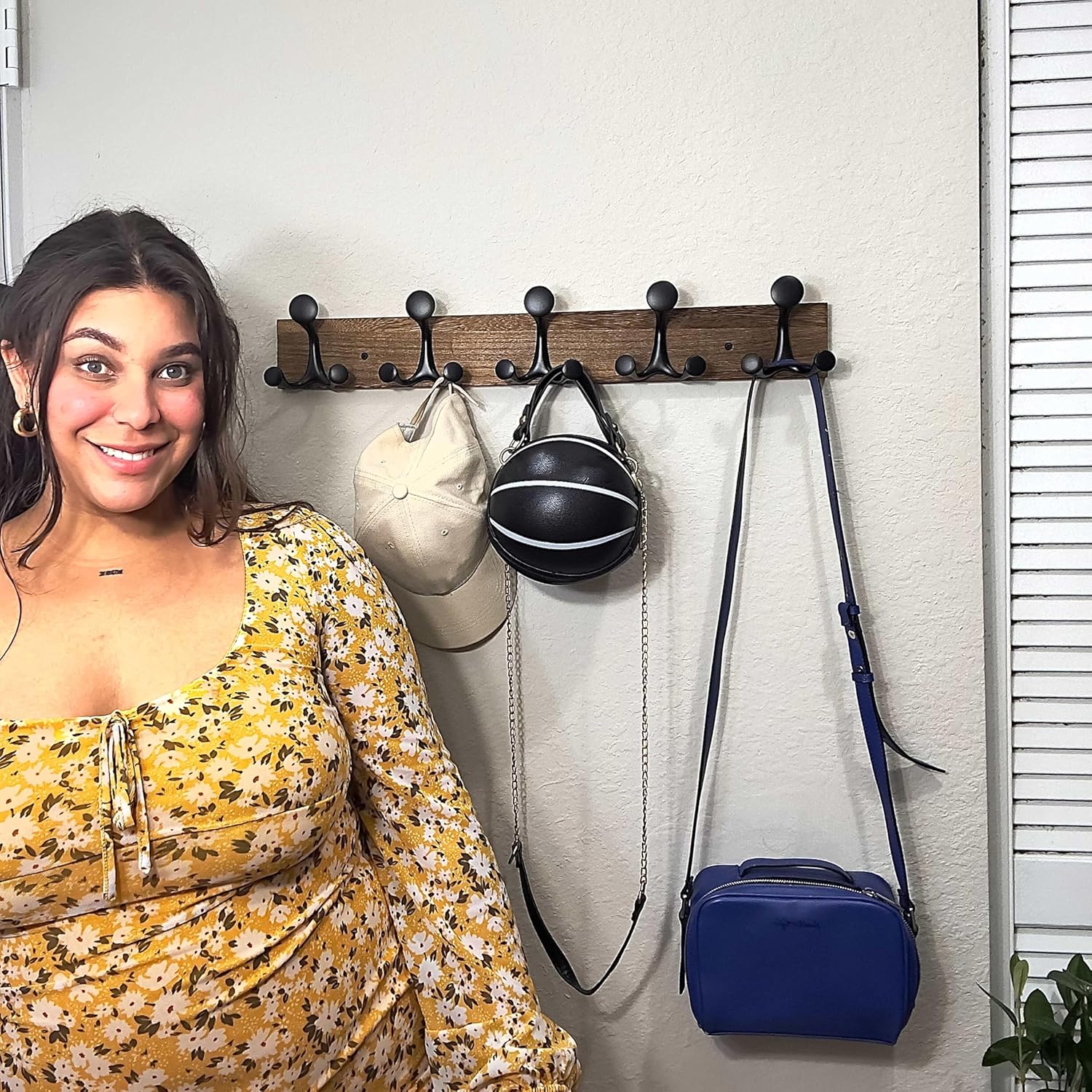 - 【Sturdiness & Large spacing】Real wood wall mount coat rack with 5 triple hooks, hang 5 or 10 jackets per rack. Plenty of space to support clothes, bags, and pet supplies, making it perfect for family.