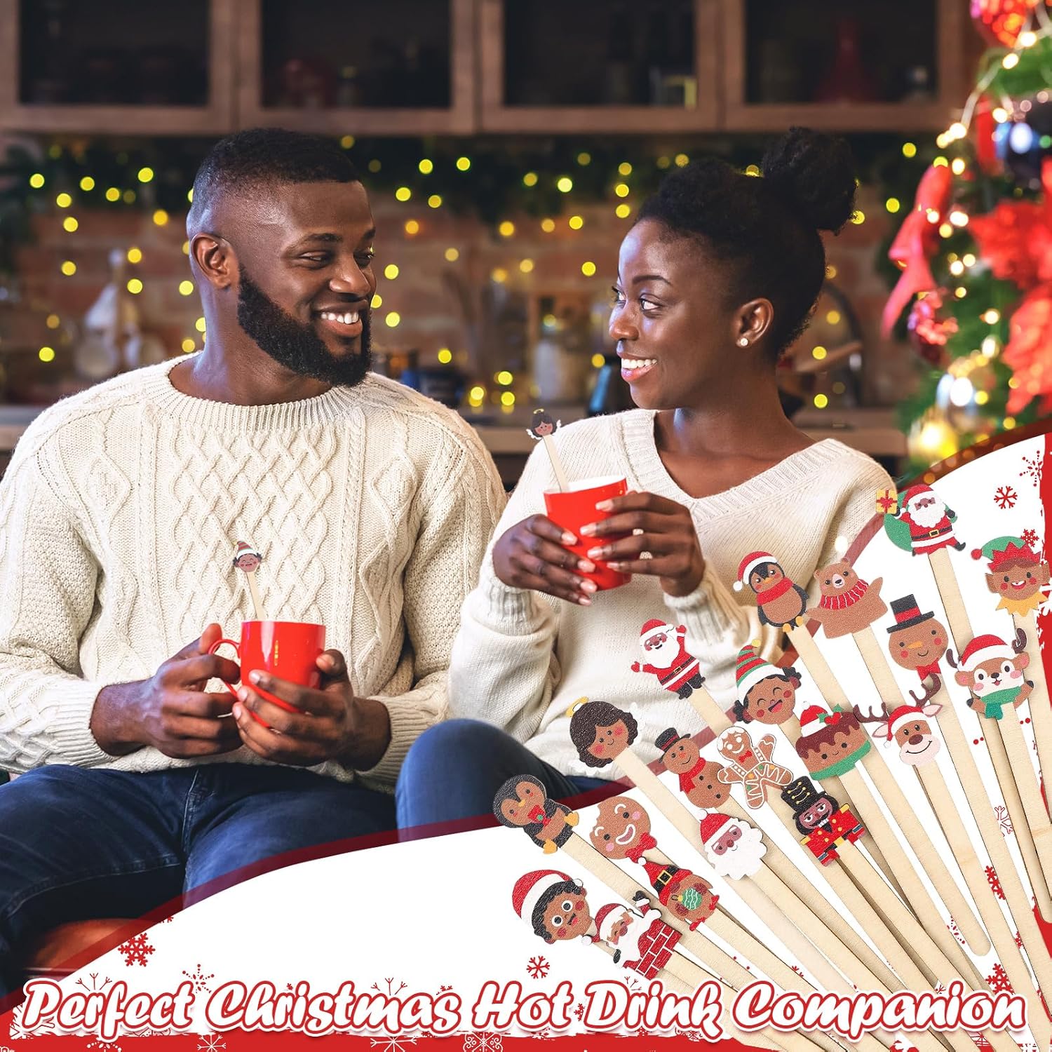 Mifoci 100 Pcs Christmas Wooded Coffee Stirrers African American Christmas Coffee Stir Sticks Disposable Stirring Sticks for Beverage Chocolate Hot Drink Party Supplies, 20 Styles (African American)