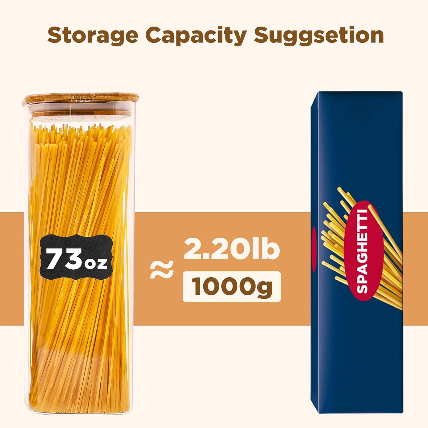 Glass Pasta Storage Jars Square 73oz, 3 Pack Glass Jars With Bamboo Lids, Tall Kitchen Storage Containers For Pasta, Storage For Pantry Organizers