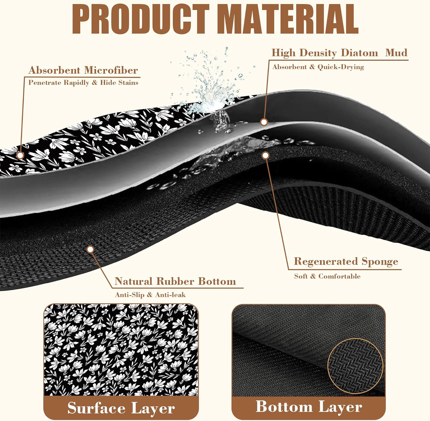 Black and White Flowers Dish Drying Mat for Kitchen Counter Coffee Bar Mat Hide Stain Absorbent Rubber Backed Drying Rack Pad Espresso Machine Coffee Bar Accessories 11.8 x 19.7 Inch