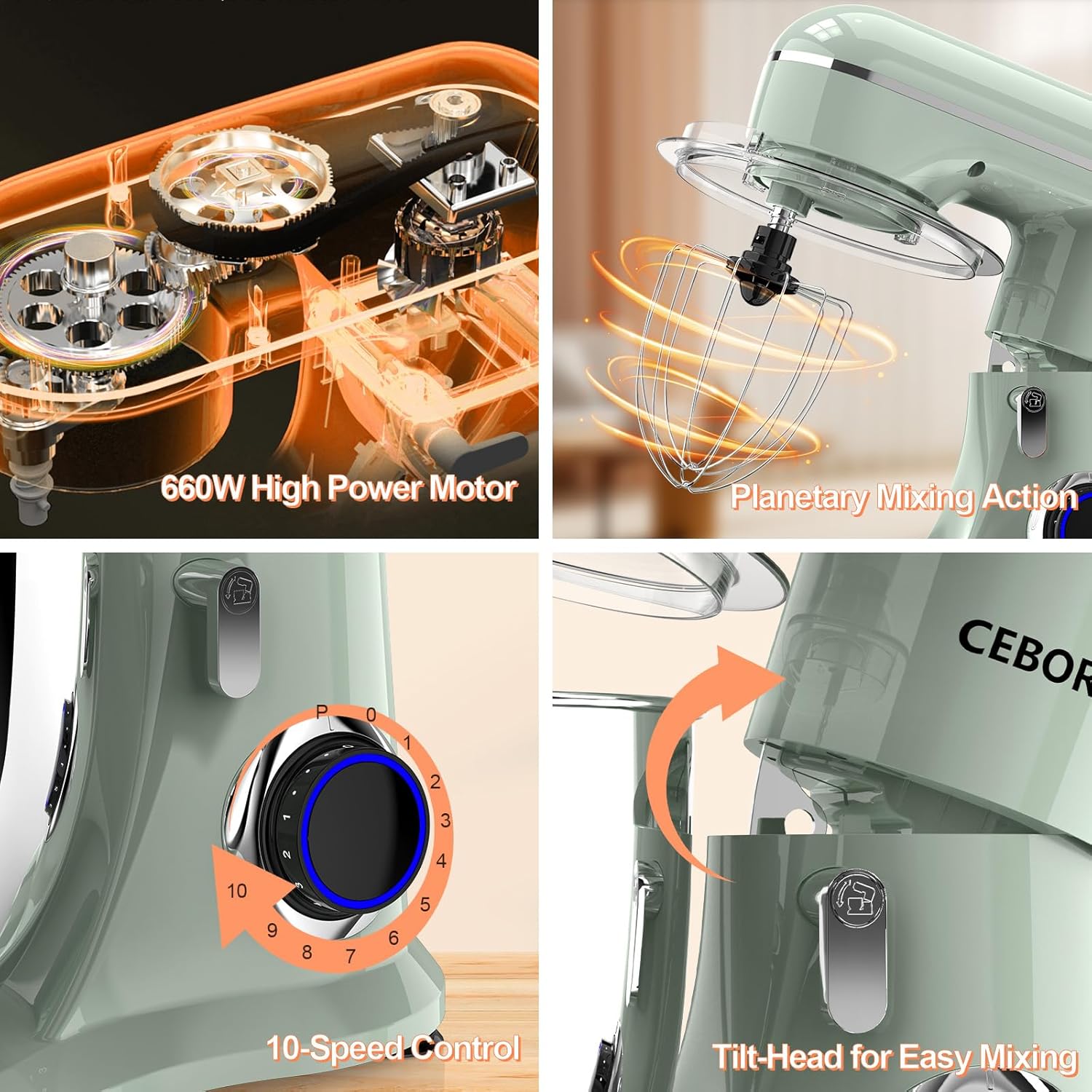 - 🍞Versatile & Efficient : CEBORY kitchen mixer boasts a multitude of functions, mixing, kneading and whisking. Featuring 10 and Pulse speed settings ranging from gentle stirring to high-speed blending - making it a powerful ally for all your culinary endeavors,such as, cakes, bread, cookies, pastry, muffins, and waffles.