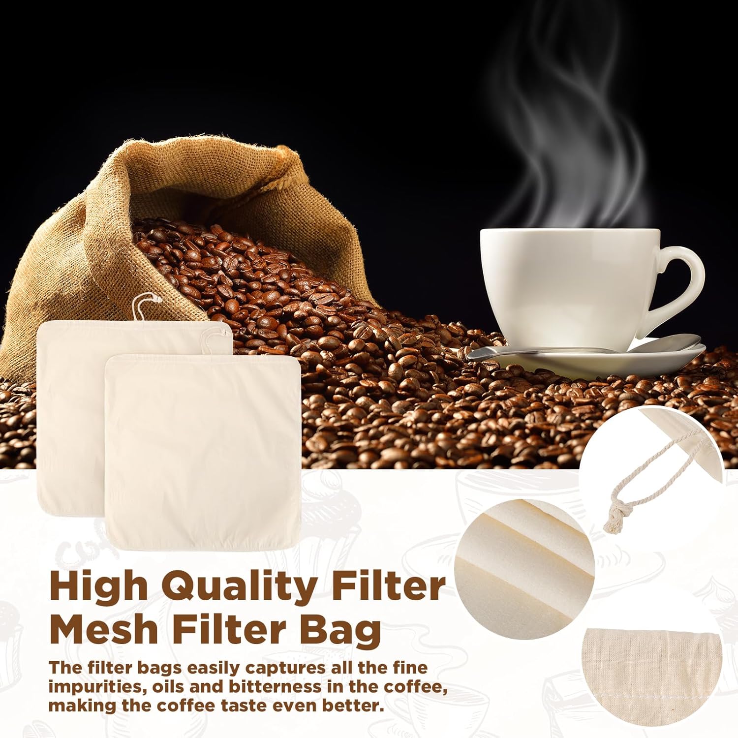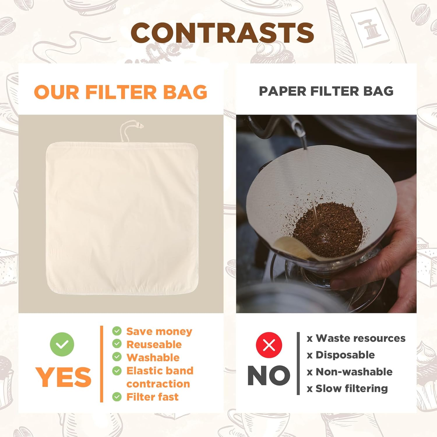- Natural Organic Cotton: the coffee filter bags is made of organic natural cotton, This is an all-natural, organic to sustainable material that can apply continuously without any harm, through the cotton filter is carefully graded to perfectly release the aroma of coffee, rich and smooth, leaving you with an endless aftertaste