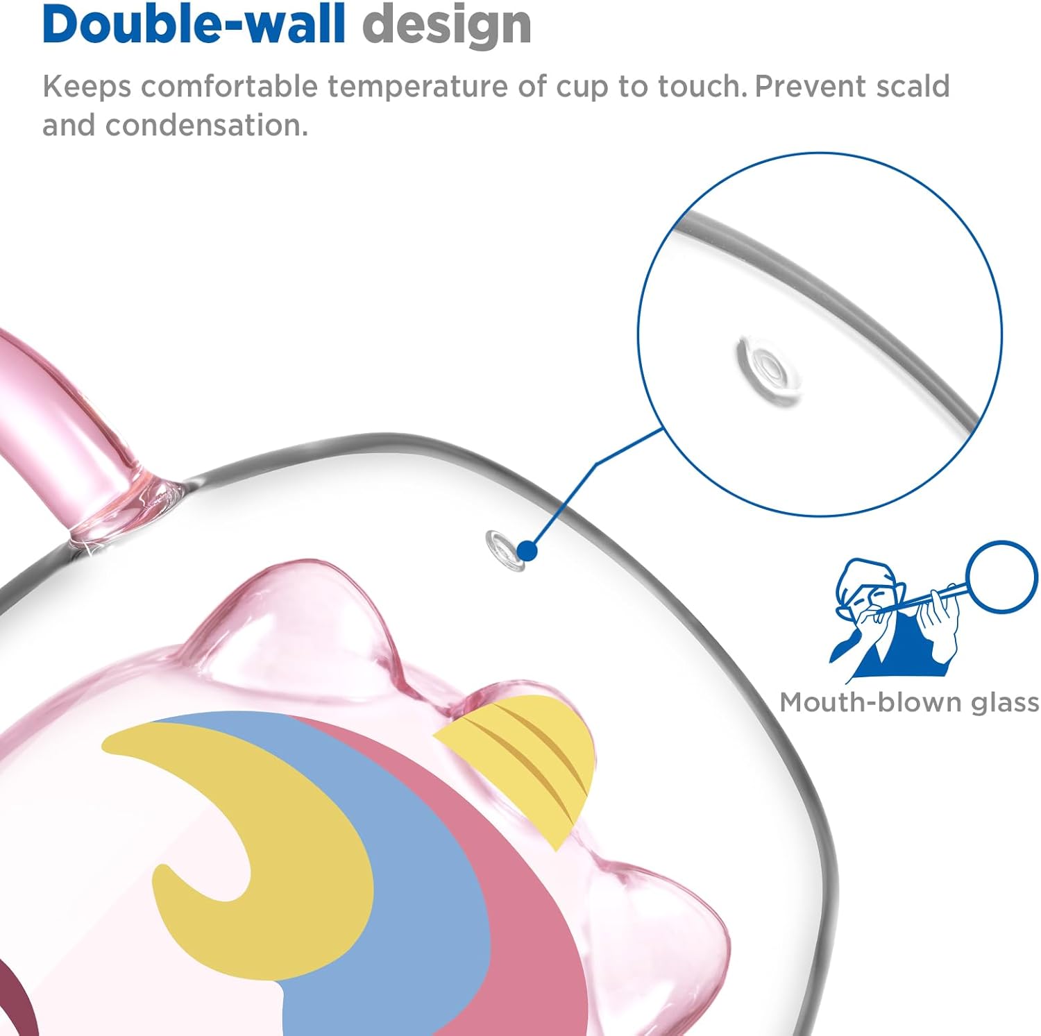 - What you get: ecooe 1*280 ml double walled cute unicorn glass cup,1*spoon, 18-month friendly product support. All glass articles are brittle, so be careful when using or washing