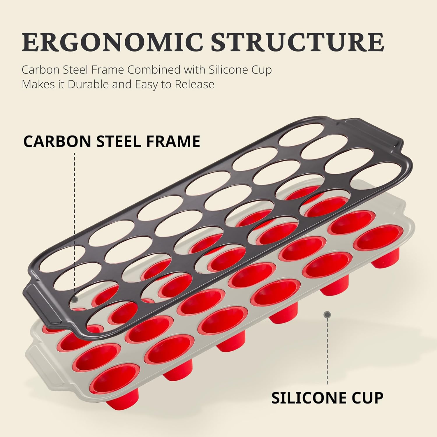 BRONYPRO Silicone Mini Muffin Pan with Metal Frame, Egg Bite Molds for Baking for Baking, Cupcake Pans 24 Regular Size, Muffin Tins Easy to Pop Nonstick Non Toxic Bakeware for Oven,Red