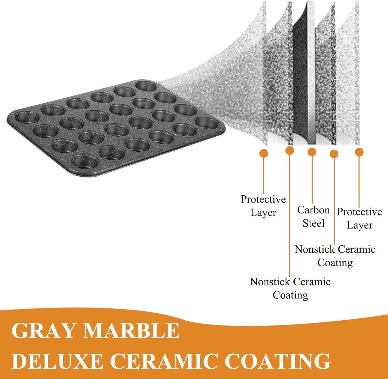 - 【PREMIUM QUALITY】This muffin pan nonstick is made of high quality carbon steel material with gray marble deluxe ceramic coating. Its rich black and white accent flecks make this bakeware both high fashion and high function.