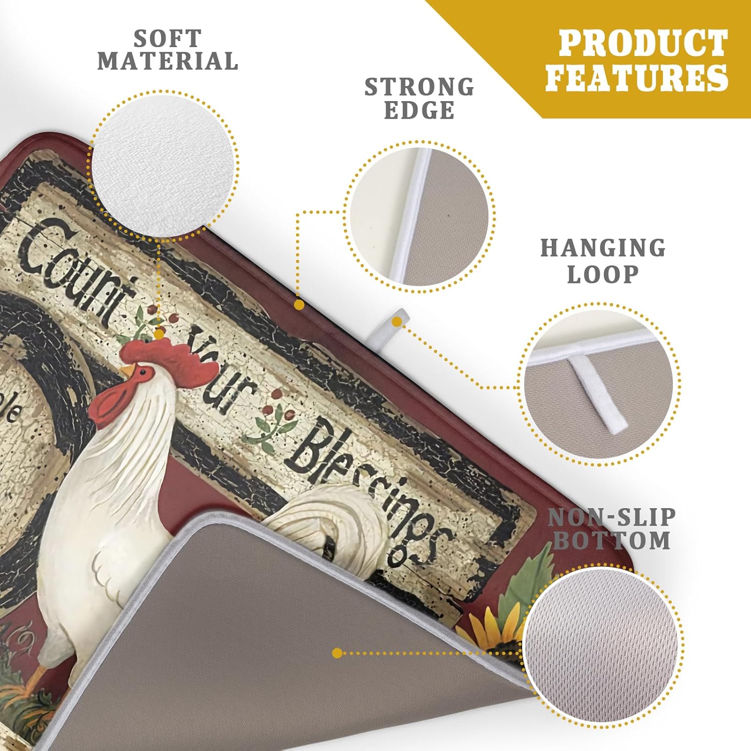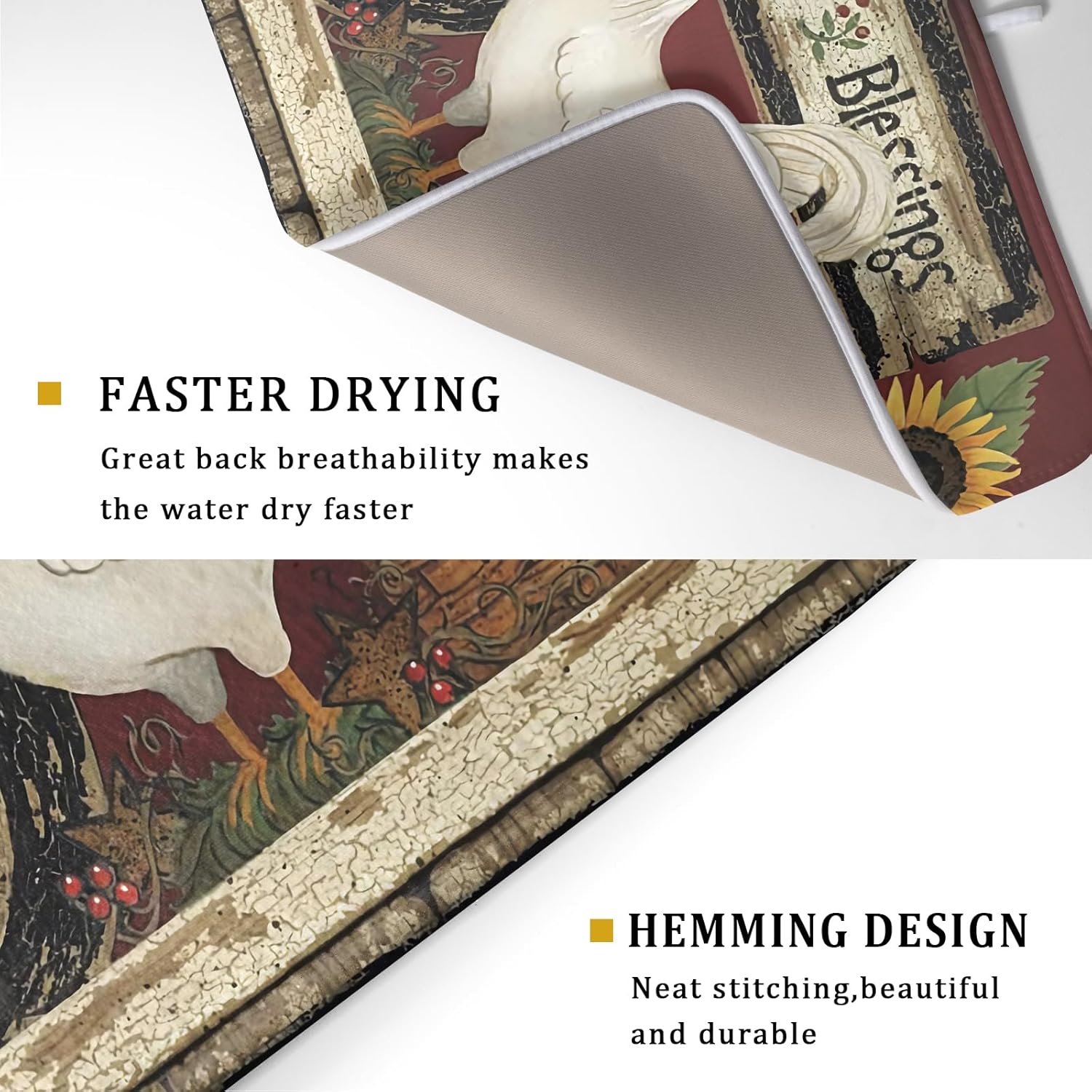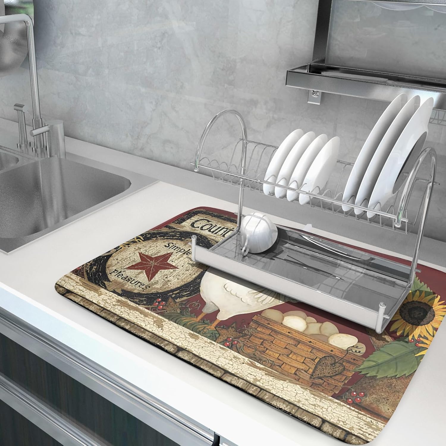 Giwawa Vintage Rooster Dish Drying Mat for Countertop, 18"x24" Farmhouse Chicken Dish Drainer Mats, Rustic Country Style Fast Drying Microfiber Dish Drying Pad Kitchen Accessories Decor Large
