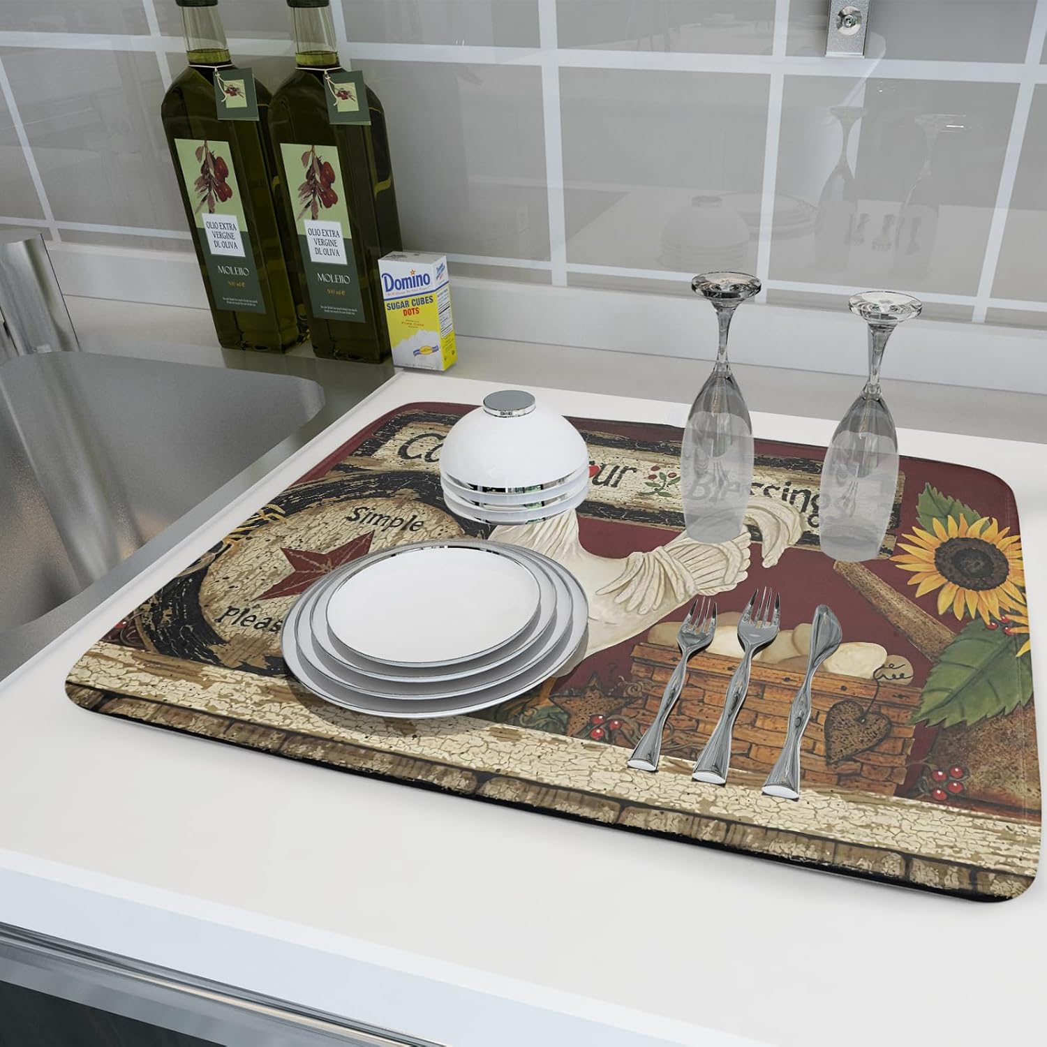 - ❀ 【SPECS & WATERPROOF BACKING】 Made of absorbent fabric, this 3-ply polyester provides a soft cushion. 24" X18", fitting most counters snugly while providing a smart and sharp look, a gorgeous decoration for kitchen. Moreover, the waterproof backing stops liquids from soaking through, damaging or staining the surface below and allows moisture to evaporate quickly at the same time.