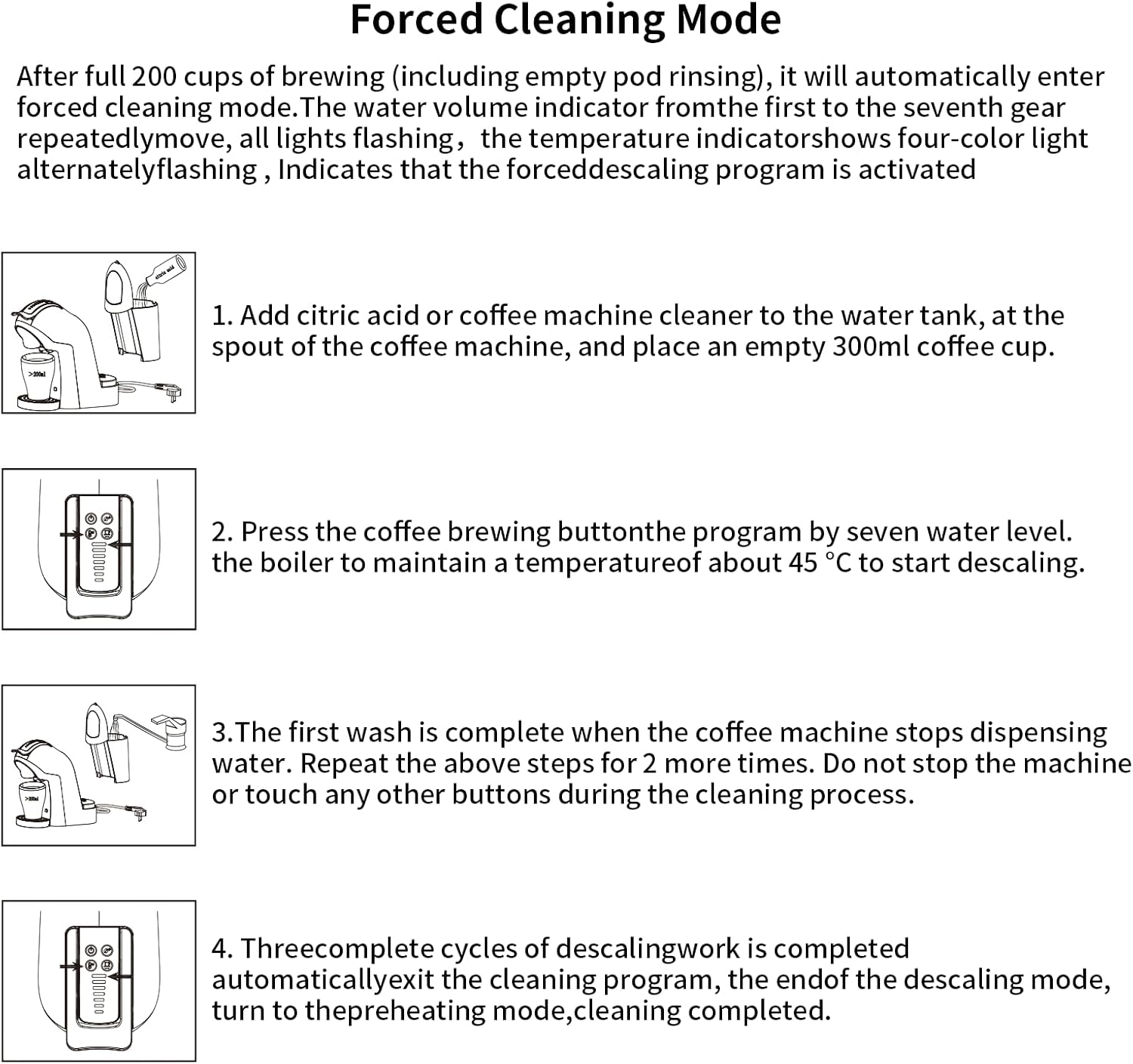 - 【Warm tip】 After 200times of brewing, Kotlie EM-308A coffee machine enters forced cleaning mode(this setting is for better long-term using): all the lights keep flashing and can not work. Then, please follow the instructions of the user manual(or reach Kotlie support team) to operate: Pour citric acid into the water tank, then press the brew button and repeat 3 times to continue to use.