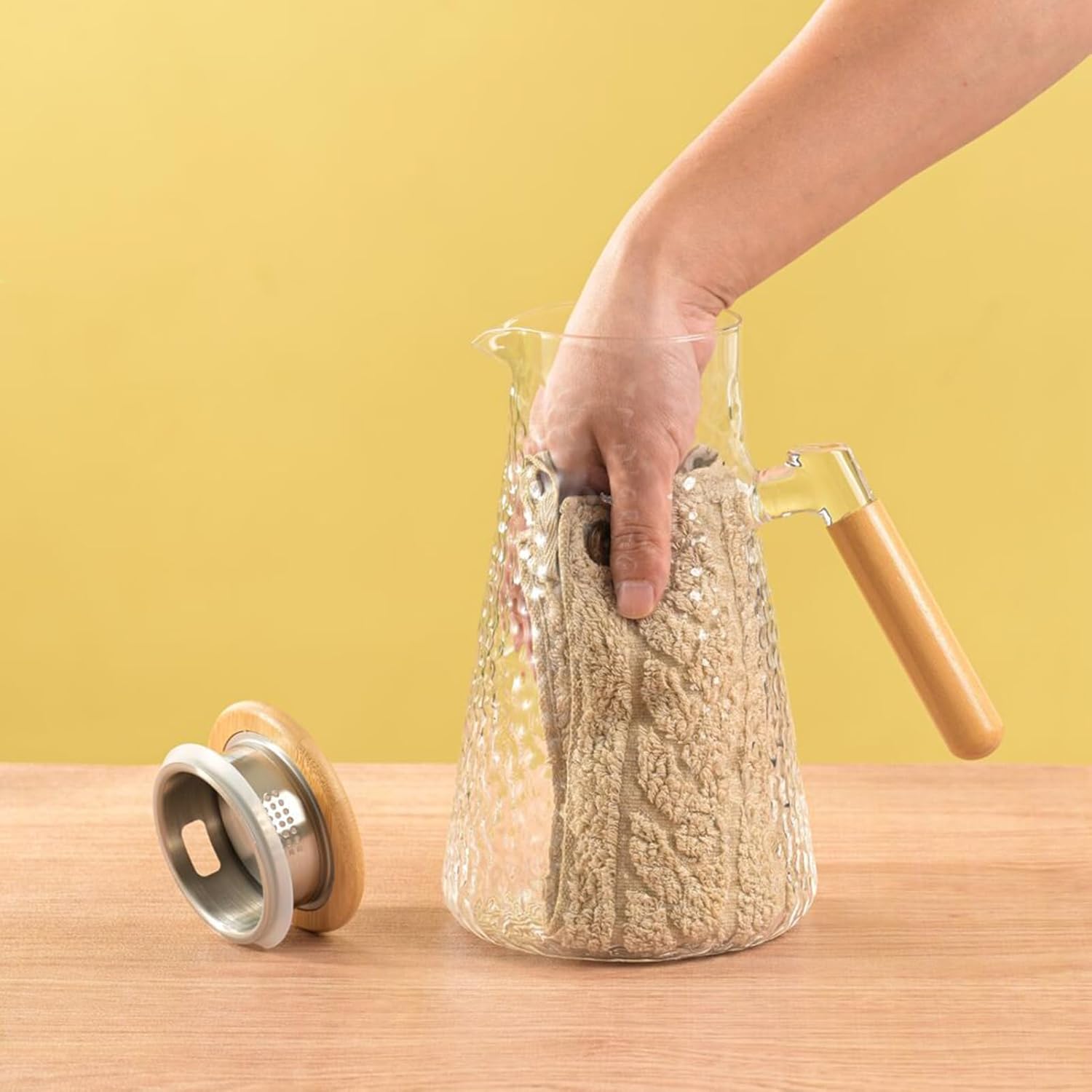 - Elegant Design: Specially designed with an anon-dripping spout and large wooden handle makes it easy to hold and pour.Handmade,beautiful looking.Glass water jug has a capacity of 60 oz/1.8 liter,allowing you to enjoy tea time with family and friends at any social gethering