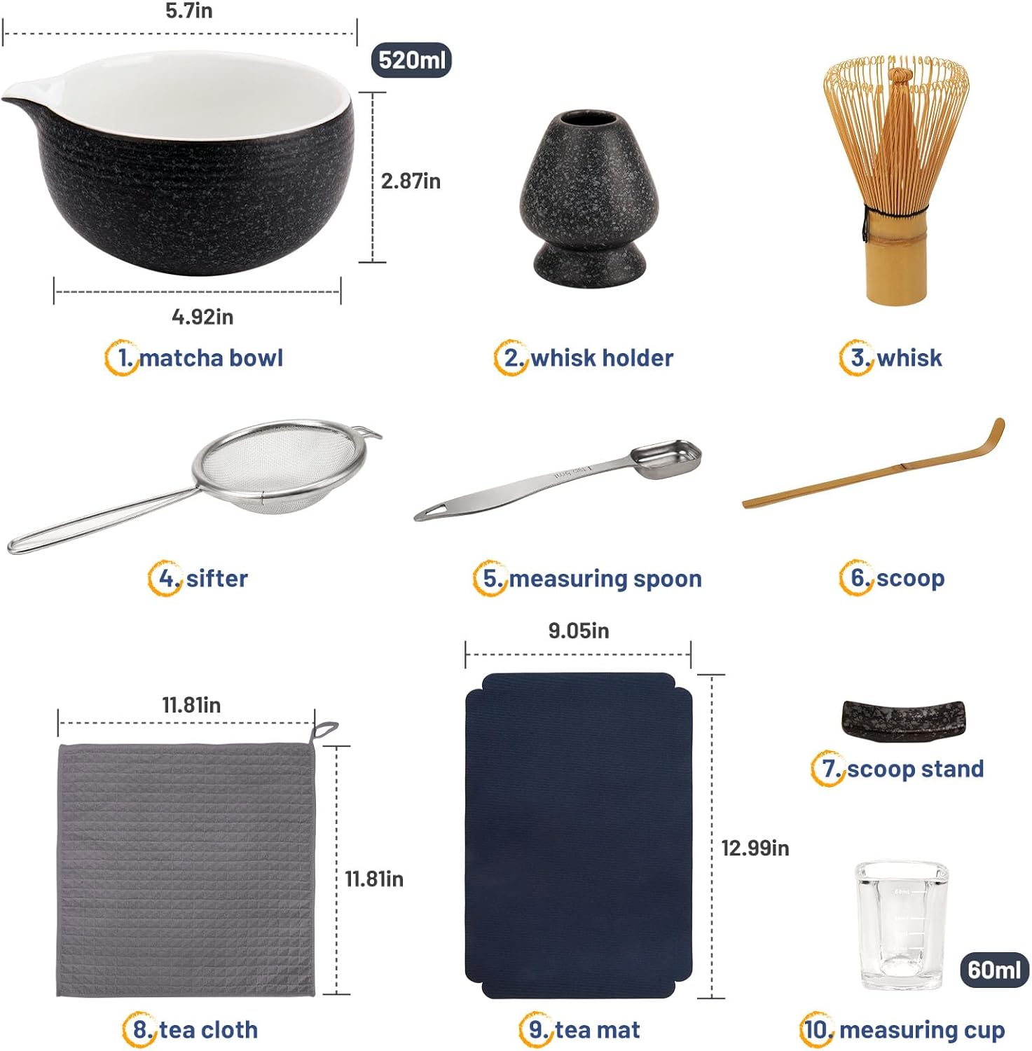 10-Pcs Matcha Kit Set, Whisk and Bowl with Spout & Measuring Spoon, Japanese Tea Making Tools, Charcoal Grey