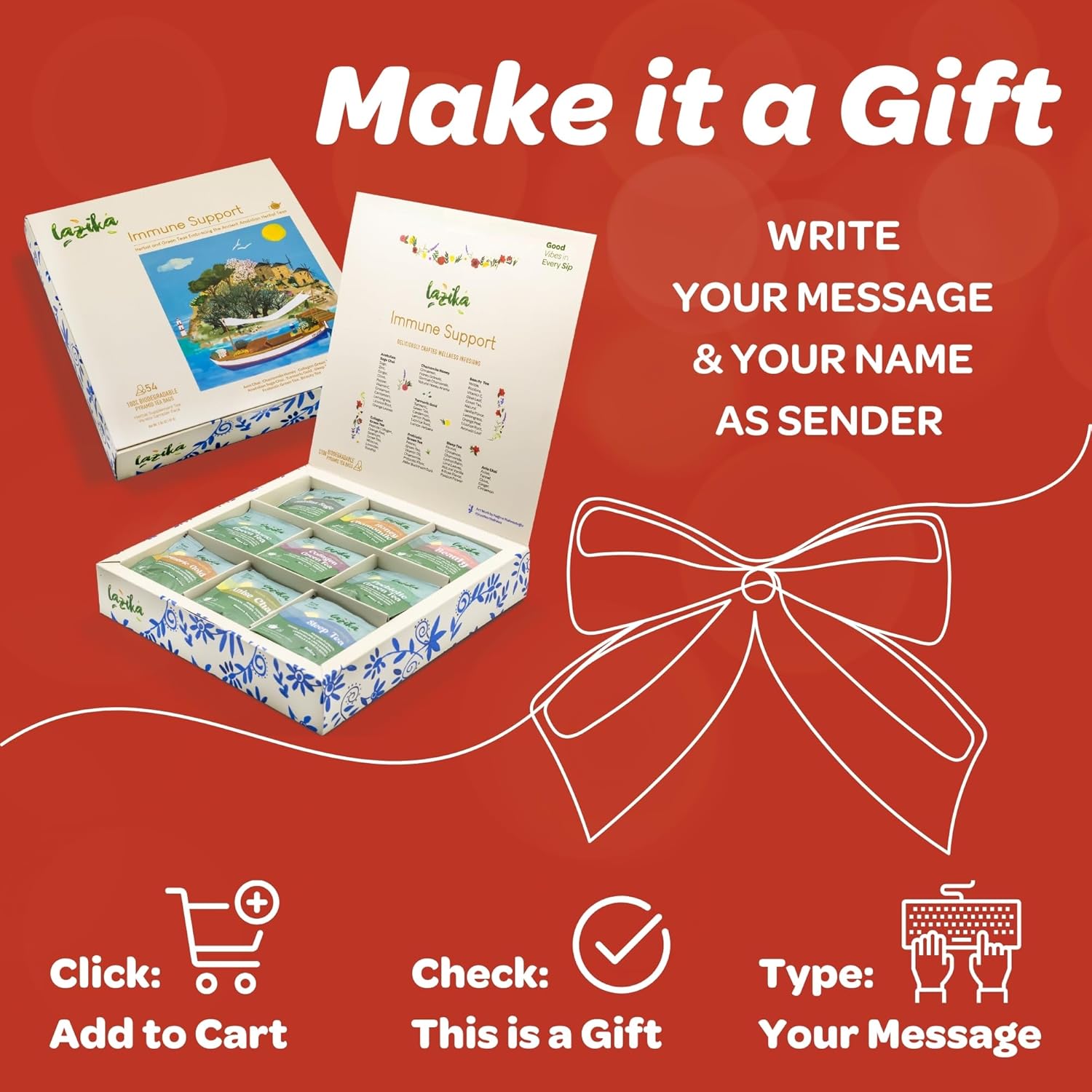 Lazika Herbal Tea Variety Pack with Lovely Presentation Box, 54 Counts, Immune Support Tea Assortment Gift Set, Premium Collection with Pyramid Infuser Bag, Handcrafted