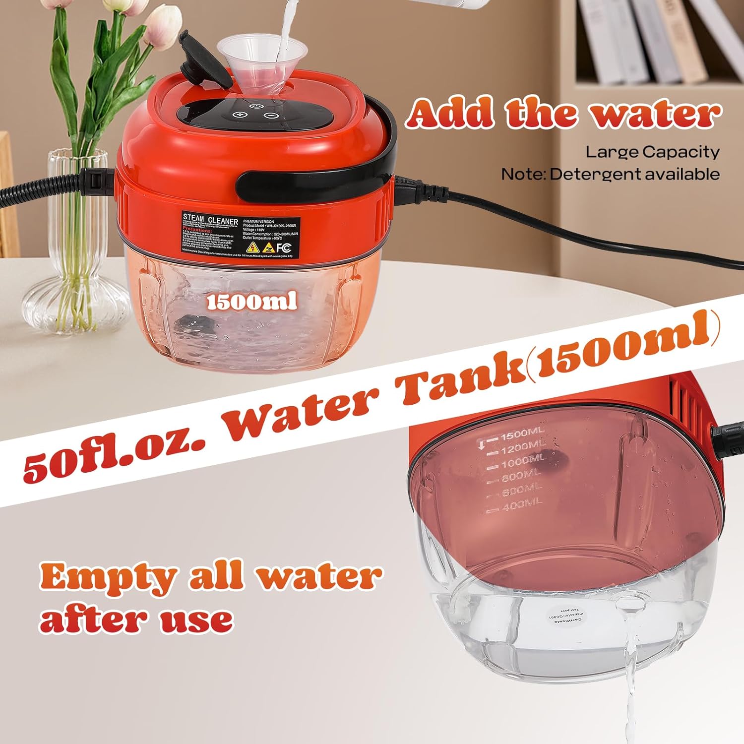- 【Large Water Tank with Outlet】This upholstery steam cleaner is equipped with a large water tank of 50 oz./1500ml capacity, allowing you to focus on cleaning instead of constantly refilling water (also supports adding water during operation). Besides, the water tank has a bottom outlet, so the portable steam cleaner can keep dry without producing odors