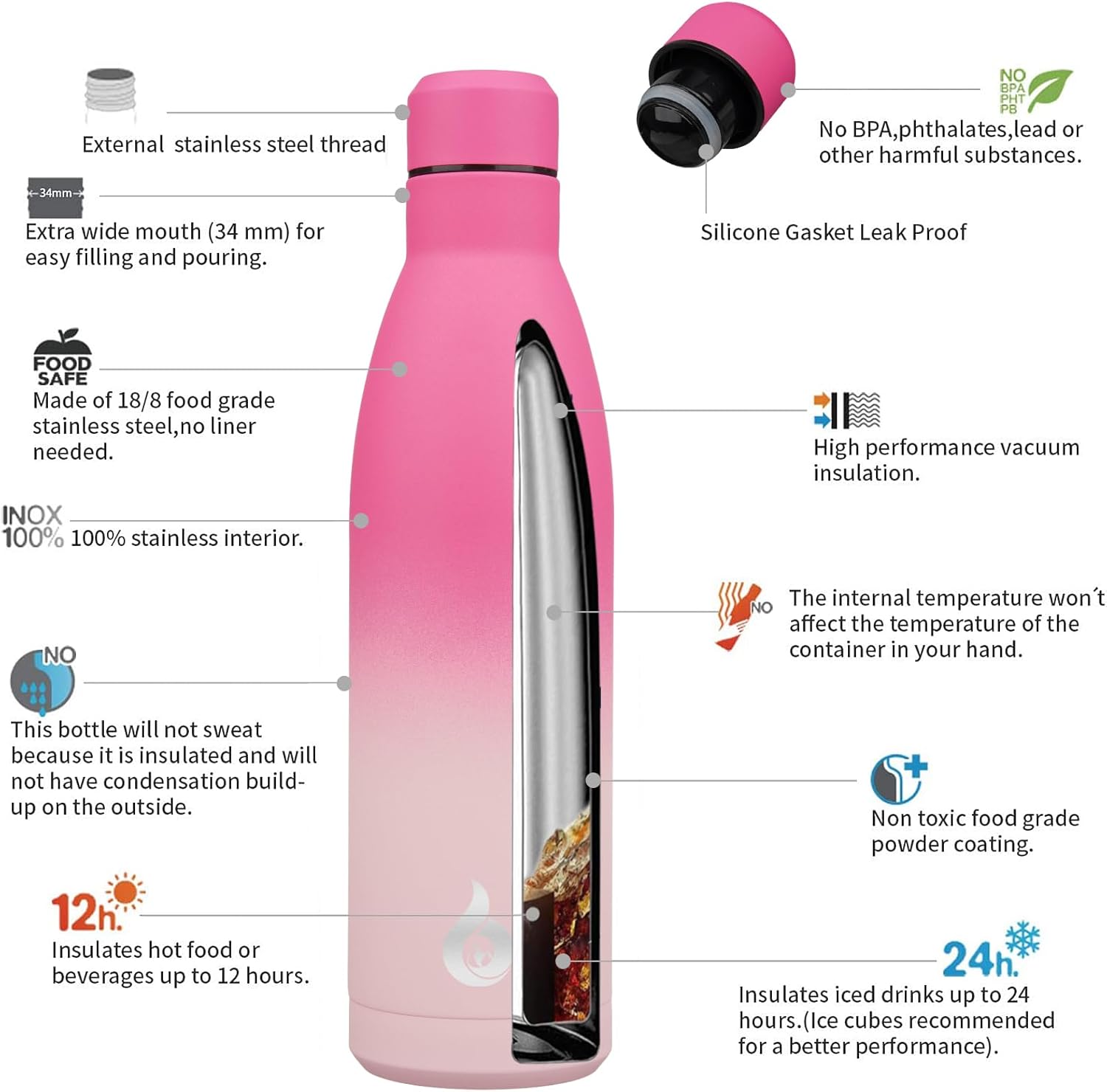 - Keep Drinks Cold & Hot: Adopt double wall vacuum insulation design, keep your drinks ice cold for 24 hours and hot for 12 hours within our highly performed insulated water bottle
