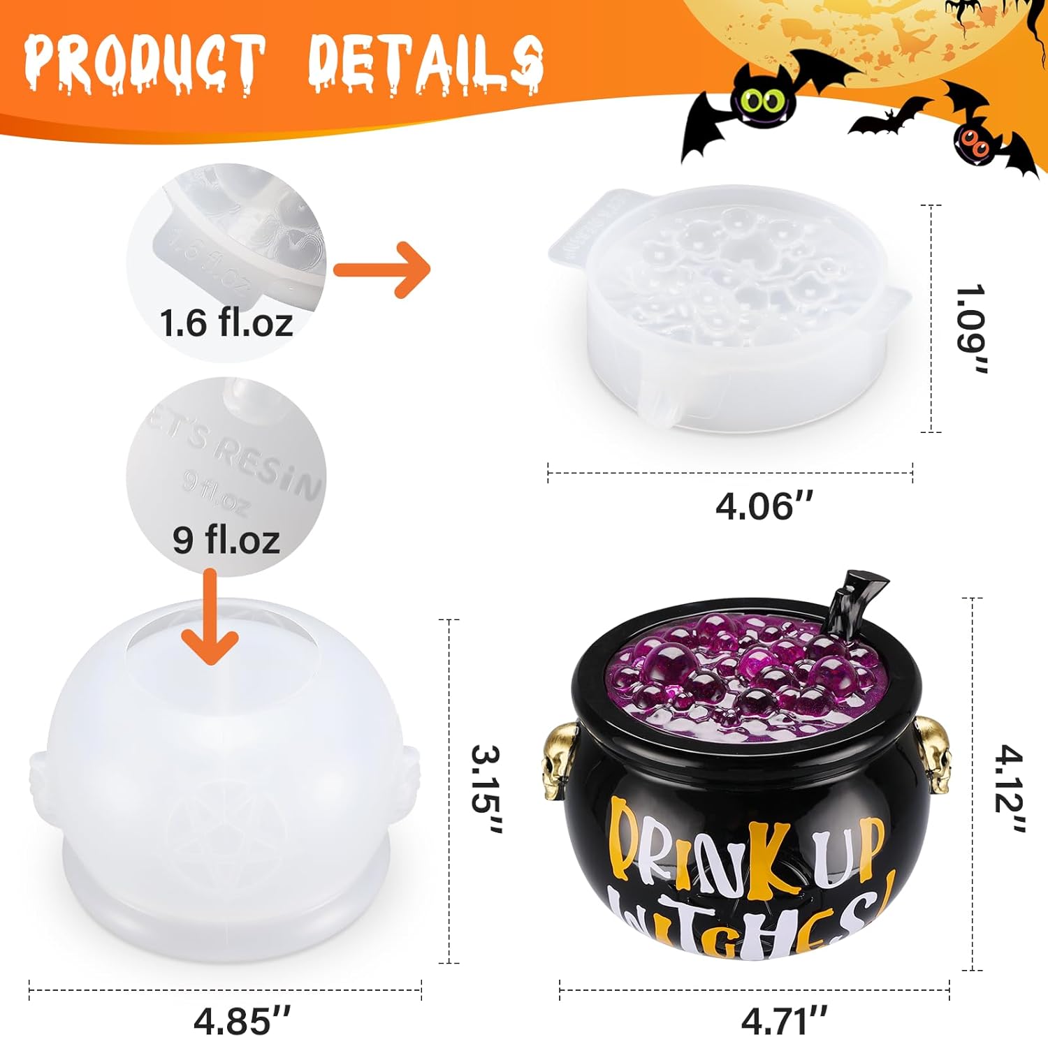 - 【Perfect Size Witch Cauldron Mold】: This cauldron resin molds is graved with resin amount mark for your reference, requiring 10.6 fl.oz epoxy resin in total to fill the lid(1.6 fl.oz) and the jar body(9 fl.oz). The finished resin cauldron is 4.7 inches width and 4.1 inches height, which is a great size in width and depth with enough space to fill it with any small goodies, perfect for kids to collect and store Halloween candy, snacks ,coins etc.