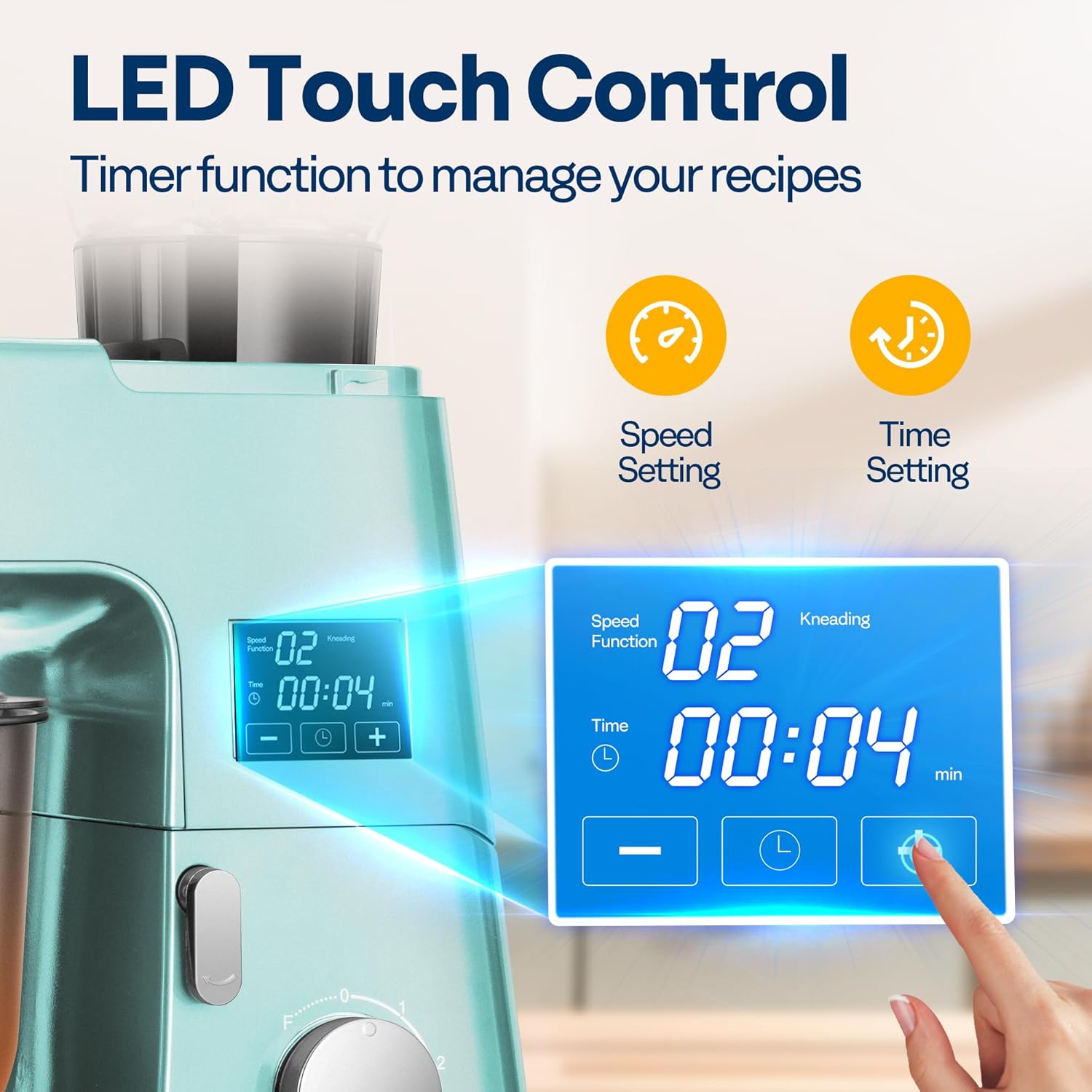 - USER-FRIENDLY DESIGN: The LED display with a built-in timer lets you control the speed and time with ease; The splash guard keeps your kitchen clean while adding ingredients; The tilt-head design allows for quick access to the bowl and attachments; The base includes suction cups to prevent movement on your countertop, ensuring stability during use; The overheat protection feature ensures safe operation, extending the mixer's lifespan