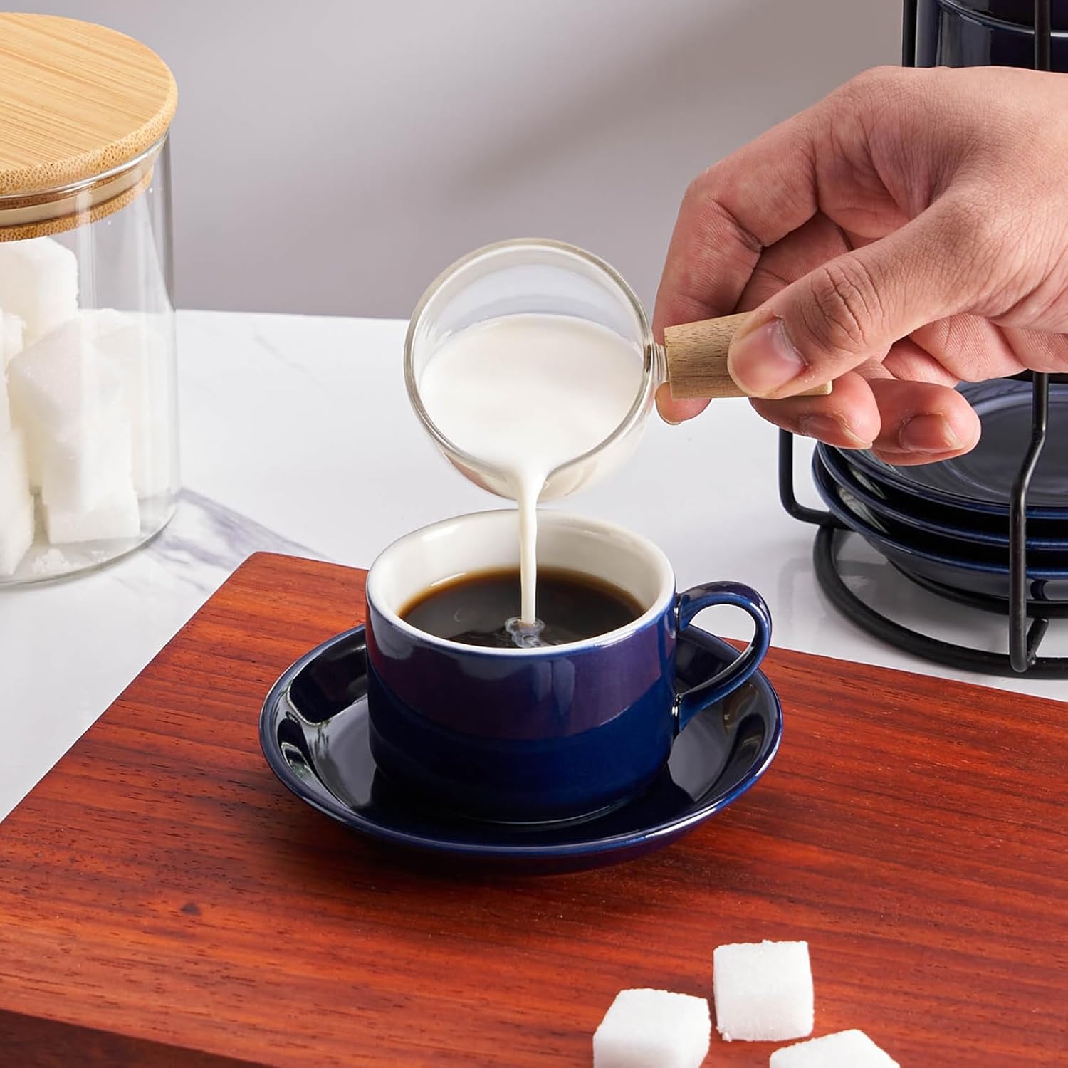 - 1.Elevate your kitchen experience with the MEICHU Espresso Cups Set. This set includes 4pcs 8 Ounce Espresso Cups with Saucers and Metal Stand, all in a classic blue color. Perfect for people who enjoy coffee and conversation!
