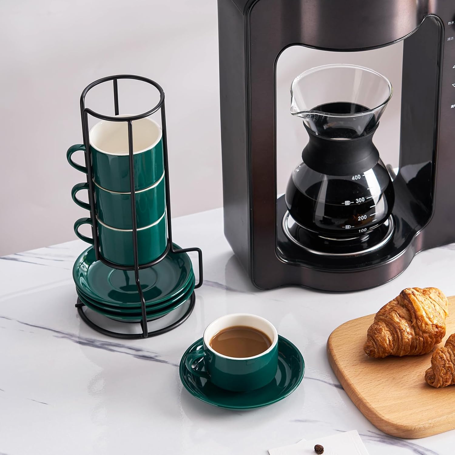 2.5oz Porcelain Stackable Espresso Cups with Saucers and Metal Stand Set of 4, Stackable Cappuccino Cups, Green Expresso Shots Cup Set for Coffee Drinks, Latte, Tea